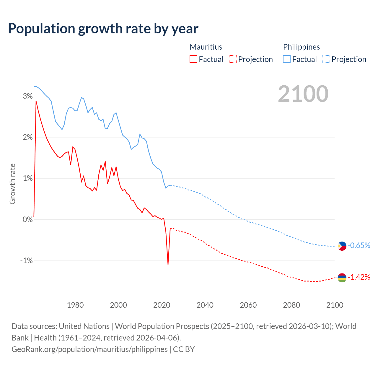 - For the last 10 years, Mauritius has had an average growth rate of -0.09% per year vs +1.16% in the Philippines.
