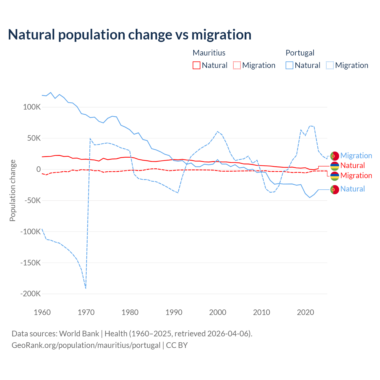 Over the last 10 years, 30.9% of the population change in Mauritius is from natural causes (a gain of 19,327 people) and 69.1% is from migration (a loss of 43,294 people). In Portugal 51% is from natural causes (a loss of 302,748 people) and 49% is from migration (a gain of 290,554 people).