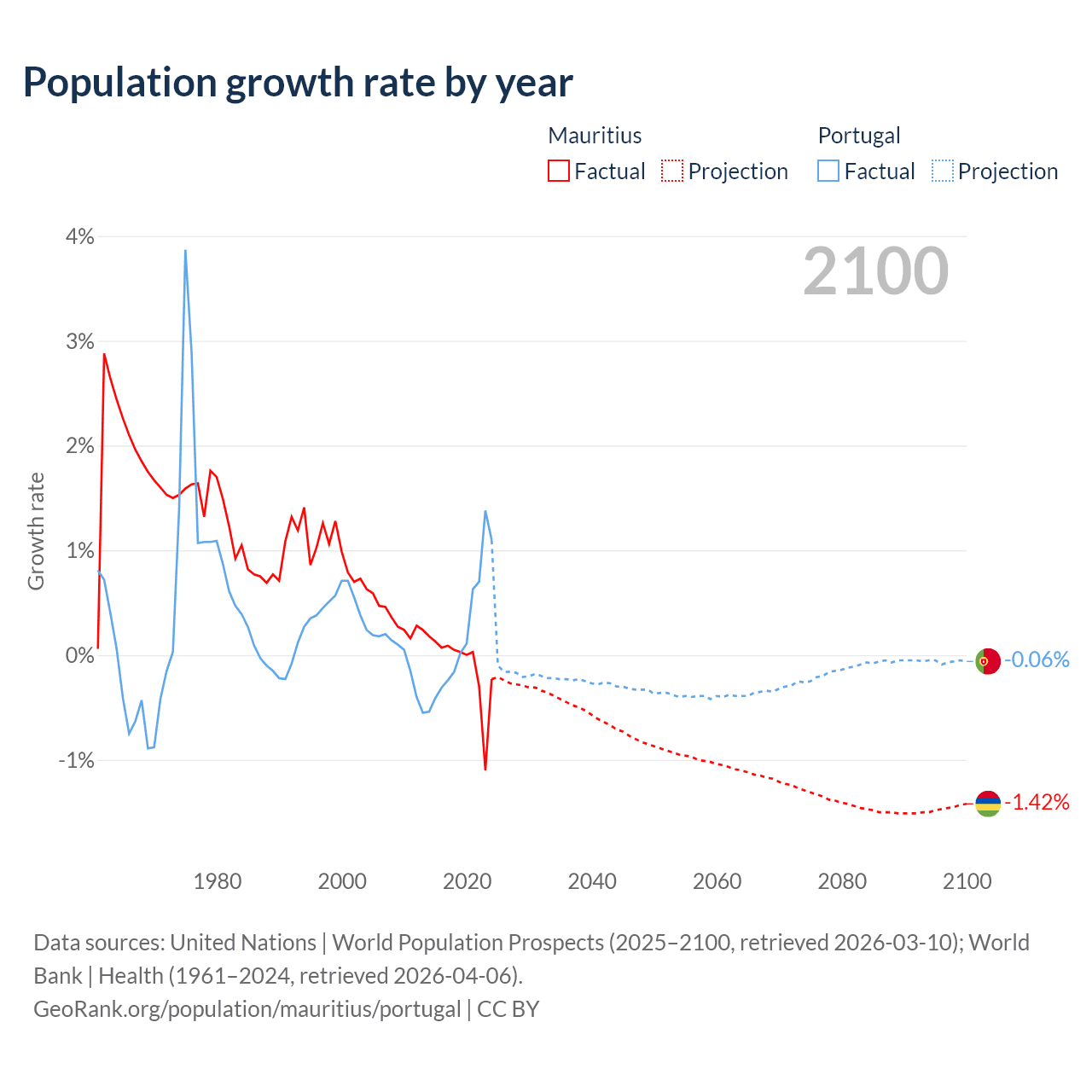 - For the last 10 years, Mauritius has had an average growth rate of -0.09% per year vs +0.21% in Portugal.