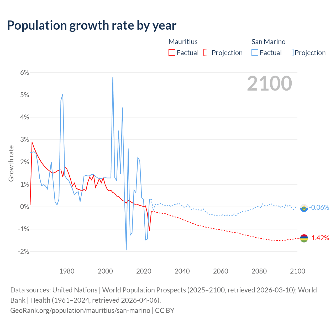 Data sources: World Bank | Health (1960–2024, retrieved 2026-04-06); United Nations | World Population Prospects (1960–2026, retrieved 2026-03-10); U.S. Census Bureau (1960–2025, retrieved 2026-02-08); Central Intelligence Agency (CIA) (2000–2019, retrieved 2026-02-20).