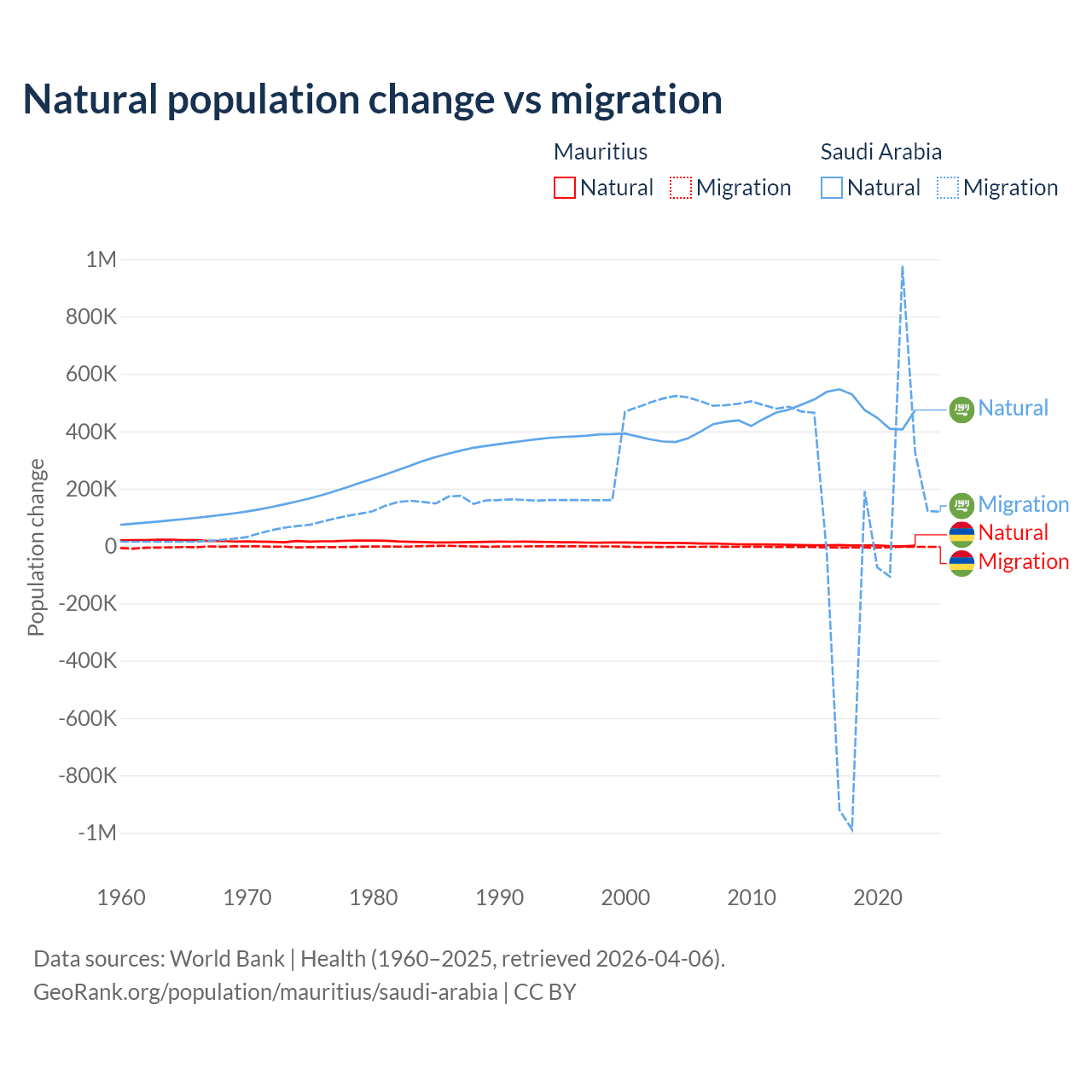 Over the last 10 years, 30.9% of the population change in Mauritius is from natural causes (a gain of 19,327 people) and 69.1% is from migration (a loss of 43,294 people). In Saudi Arabia 93.9% is from natural causes (a gain of 4,829,562 people) and 6.05% is from migration (a gain of 311,209 people).