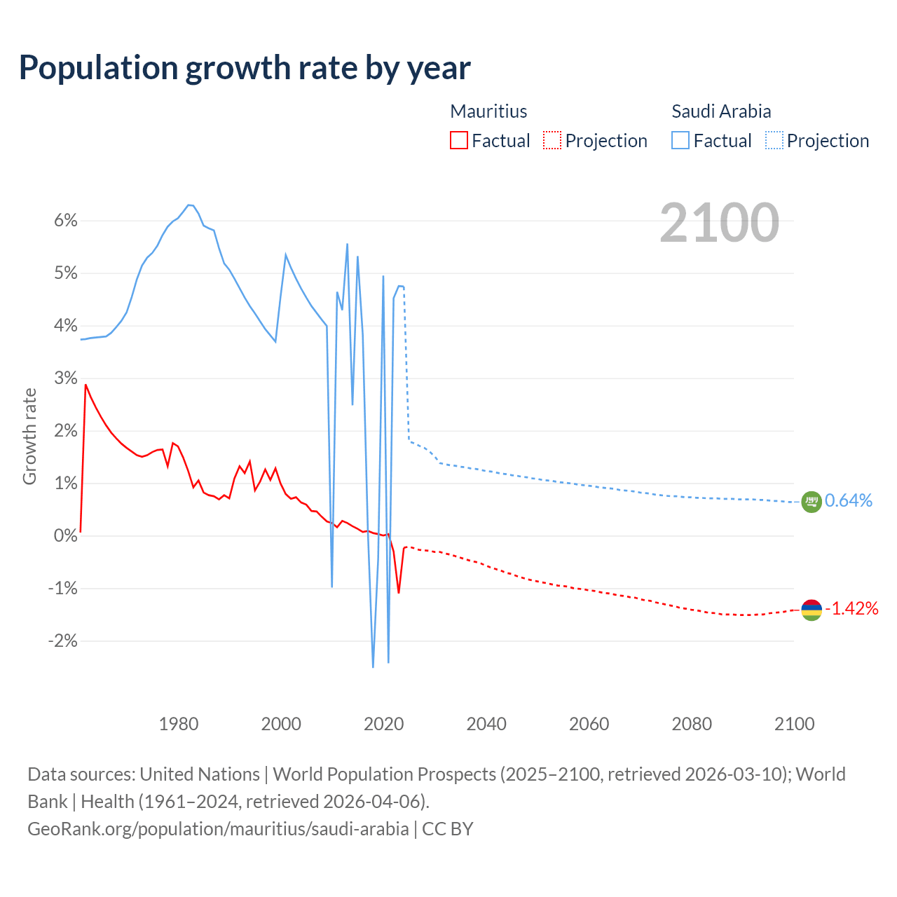 - For the last 10 years, Mauritius has had an average growth rate of -0.09% per year vs +2.3% in Saudi Arabia.
