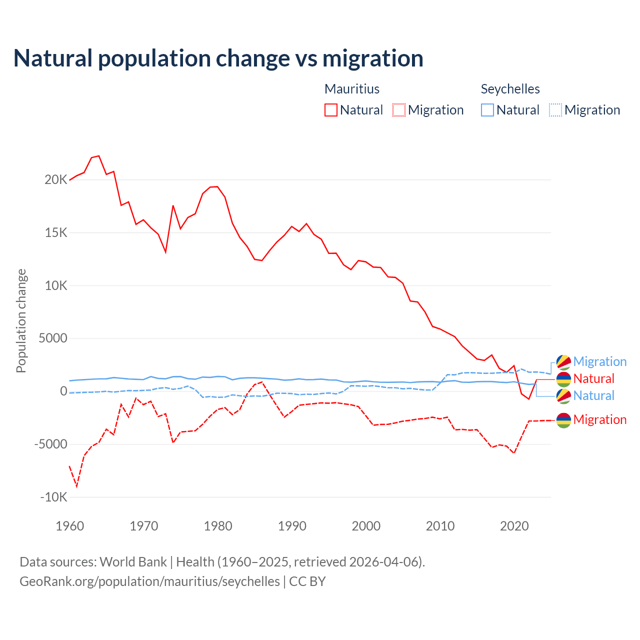 Over the last 10 years, 30.9% of the population change in Mauritius is from natural causes (a gain of 19,327 people) and 69.1% is from migration (a loss of 43,294 people). In the Seychelles 31.4% is from natural causes (a gain of 8,122 people) and 68.6% is from migration (a gain of 17,748 people).