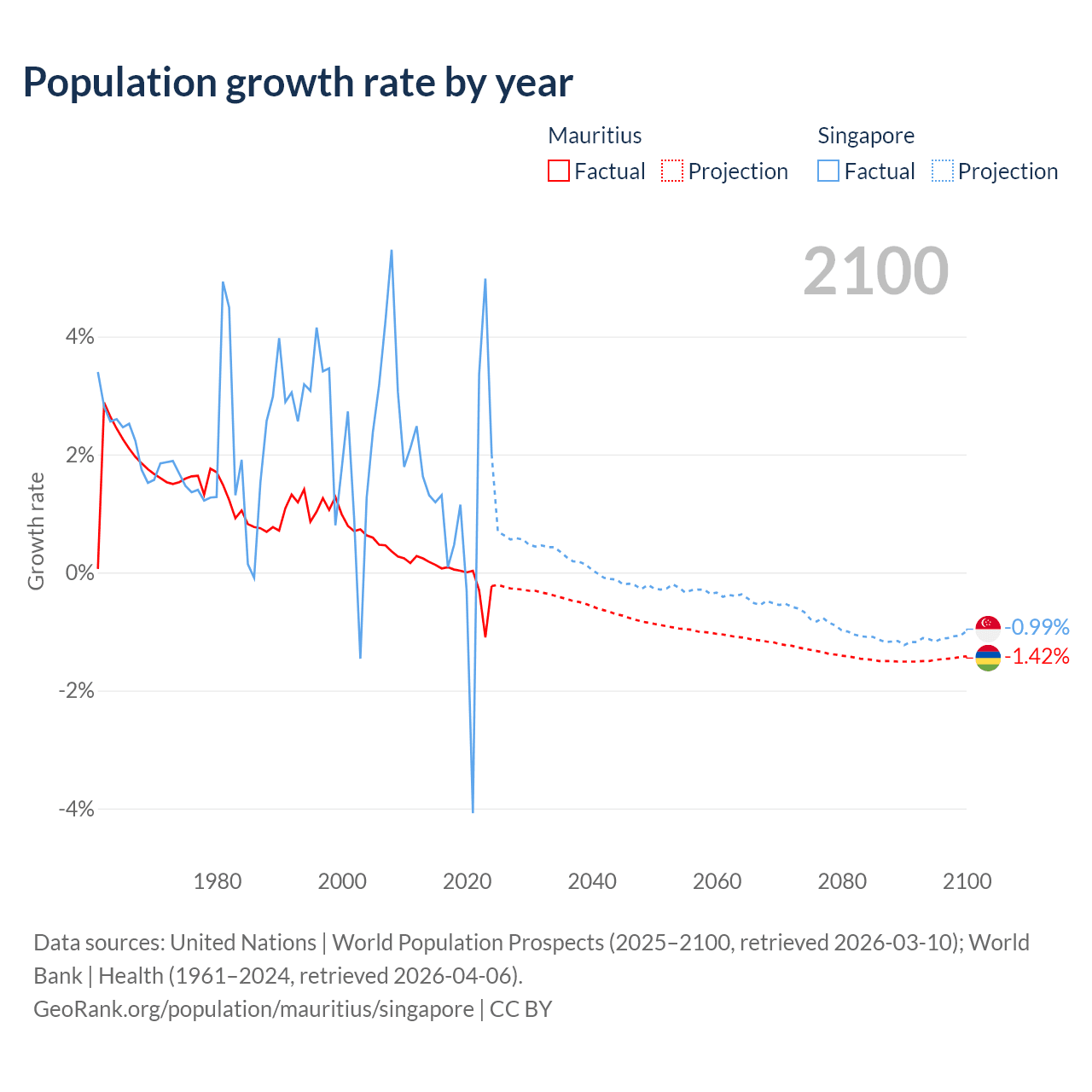 - For the last 10 years, Mauritius has had an average growth rate of -0.09% per year vs +1.04% in Singapore.