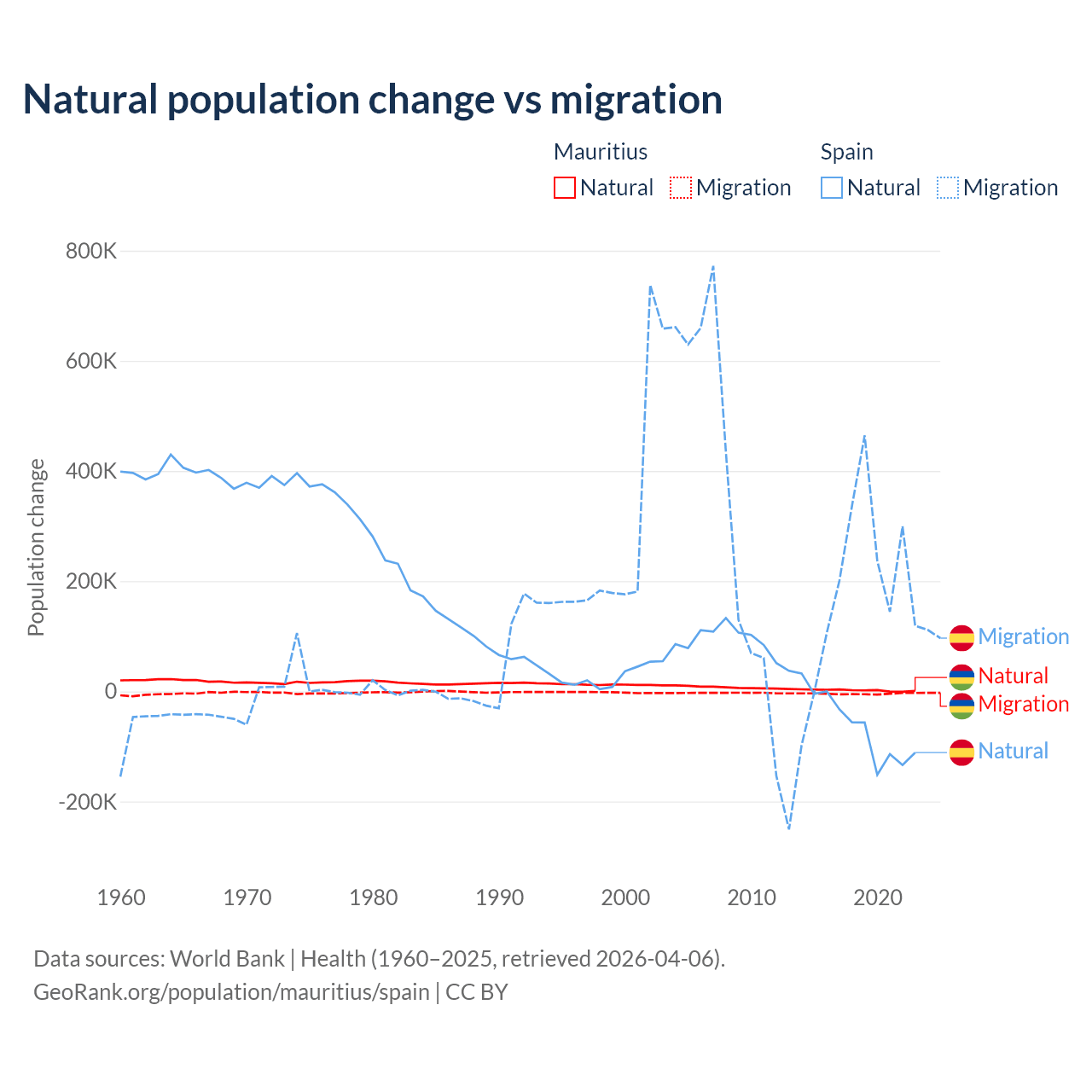 Over the last 10 years, 30.9% of the population change in Mauritius is from natural causes (a gain of 19,327 people) and 69.1% is from migration (a loss of 43,294 people). In Spain 25.8% is from natural causes (a loss of 627,829 people) and 74.2% is from migration (a gain of 1,810,127 people).