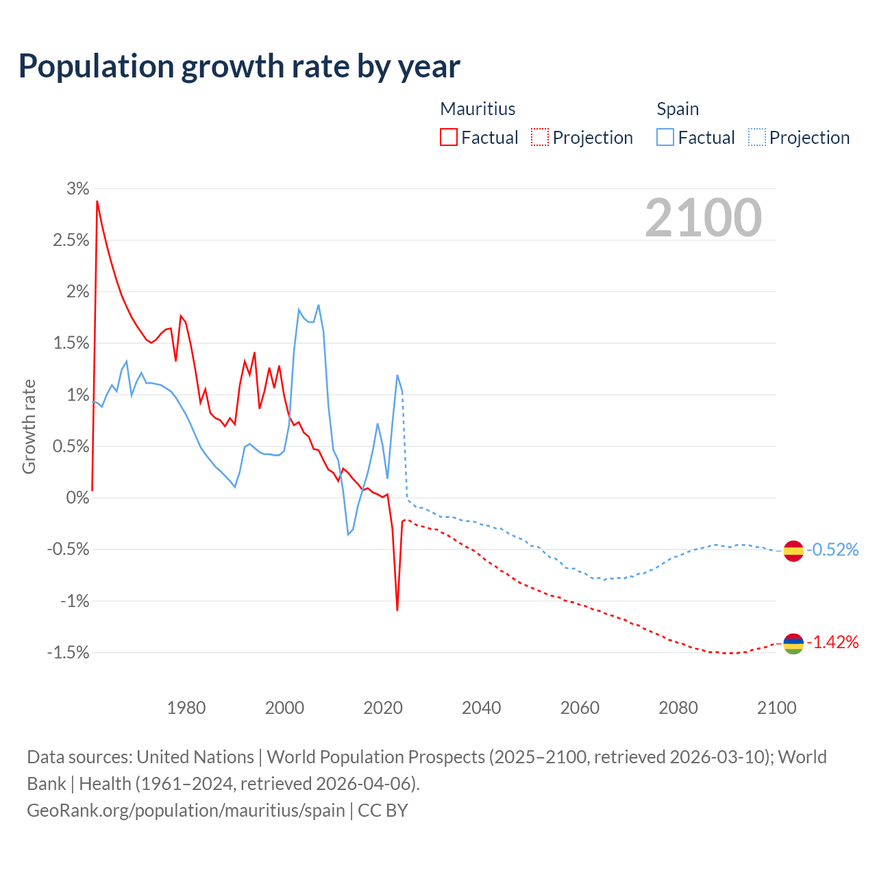 - For the last 10 years, Mauritius has had an average growth rate of -0.09% per year vs +0.43% in Spain.