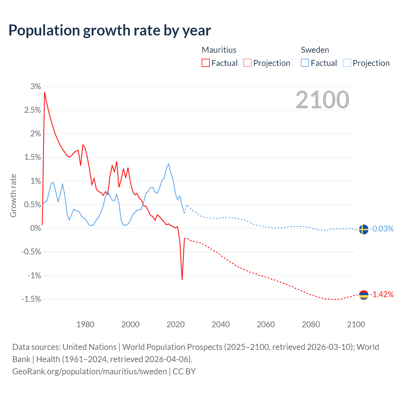 - For the last 10 years, Mauritius has had an average growth rate of -0.09% per year vs +0.88% in Sweden.