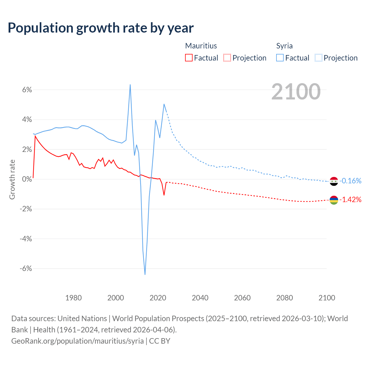- For the last 10 years, Mauritius has had an average growth rate of -0.09% per year vs +1.25% in Syria.
