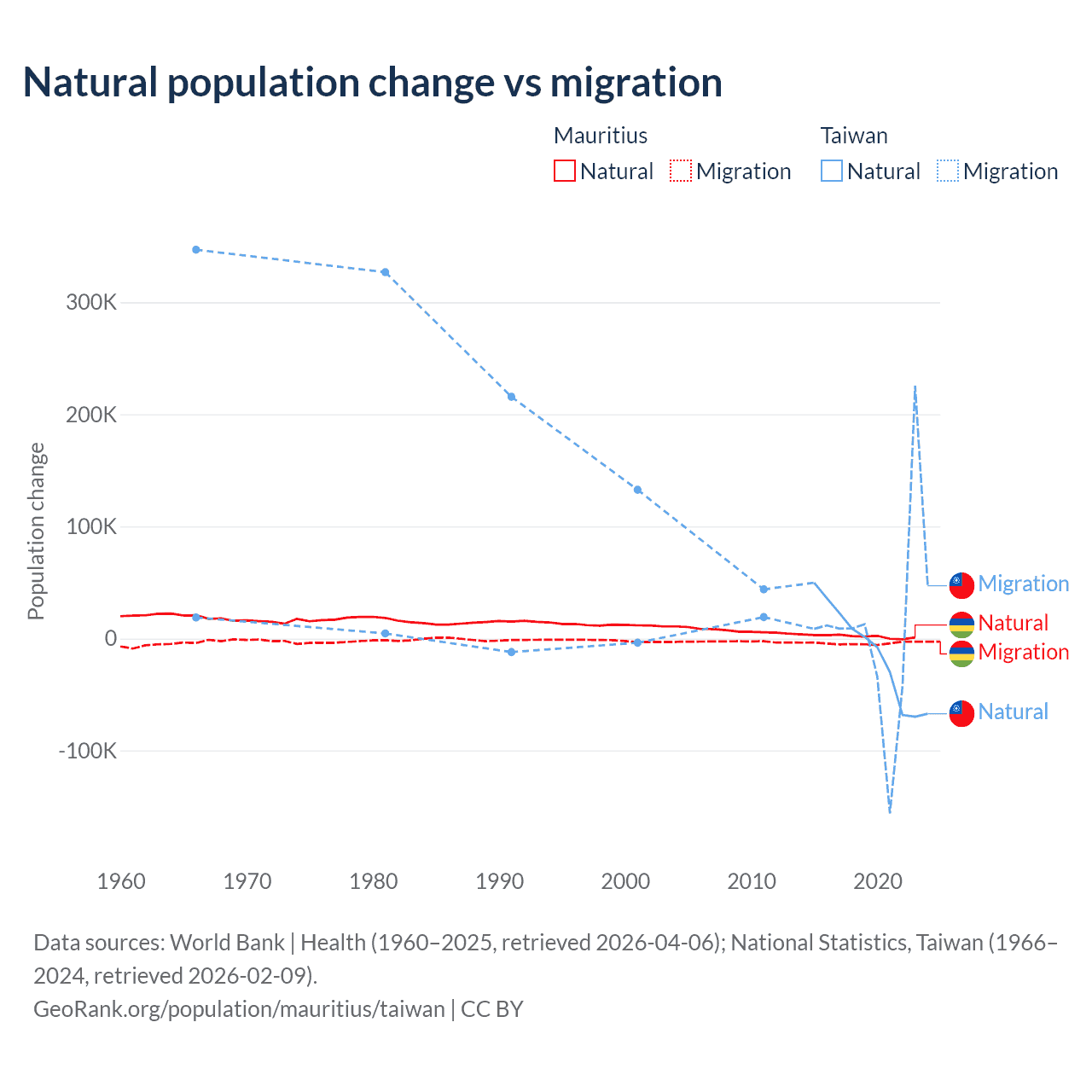 Over the last 10 years, 30.9% of the population change in Mauritius is from natural causes (a gain of 19,327 people) and 69.1% is from migration (a loss of 43,294 people). In Taiwan 56.7% is from natural causes (a loss of 57,467 people) and 43.3% is from migration (a gain of 43,884 people).