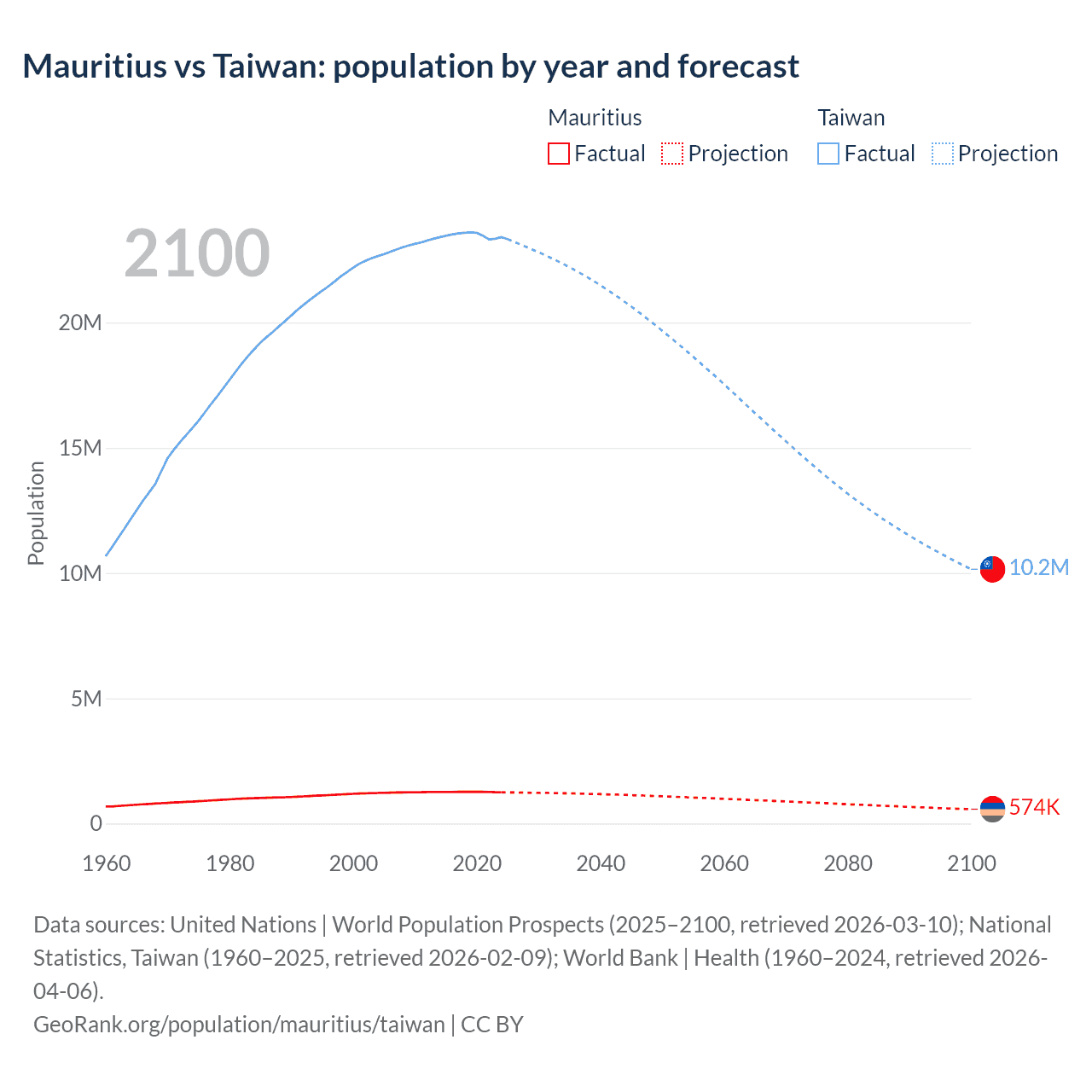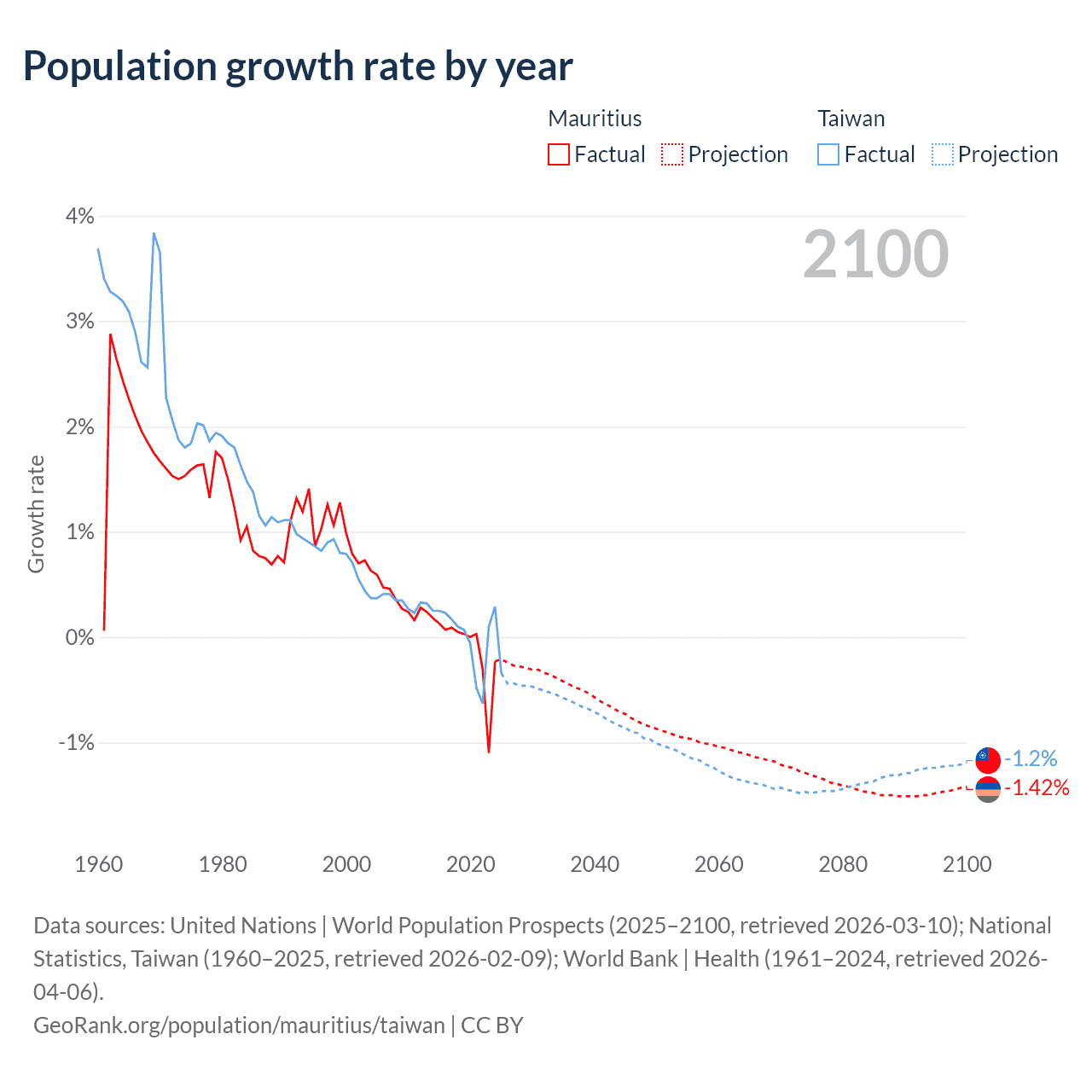 - For the last 10 years, Mauritius has had an average growth rate of -0.09% per year vs -0.03% in Taiwan.