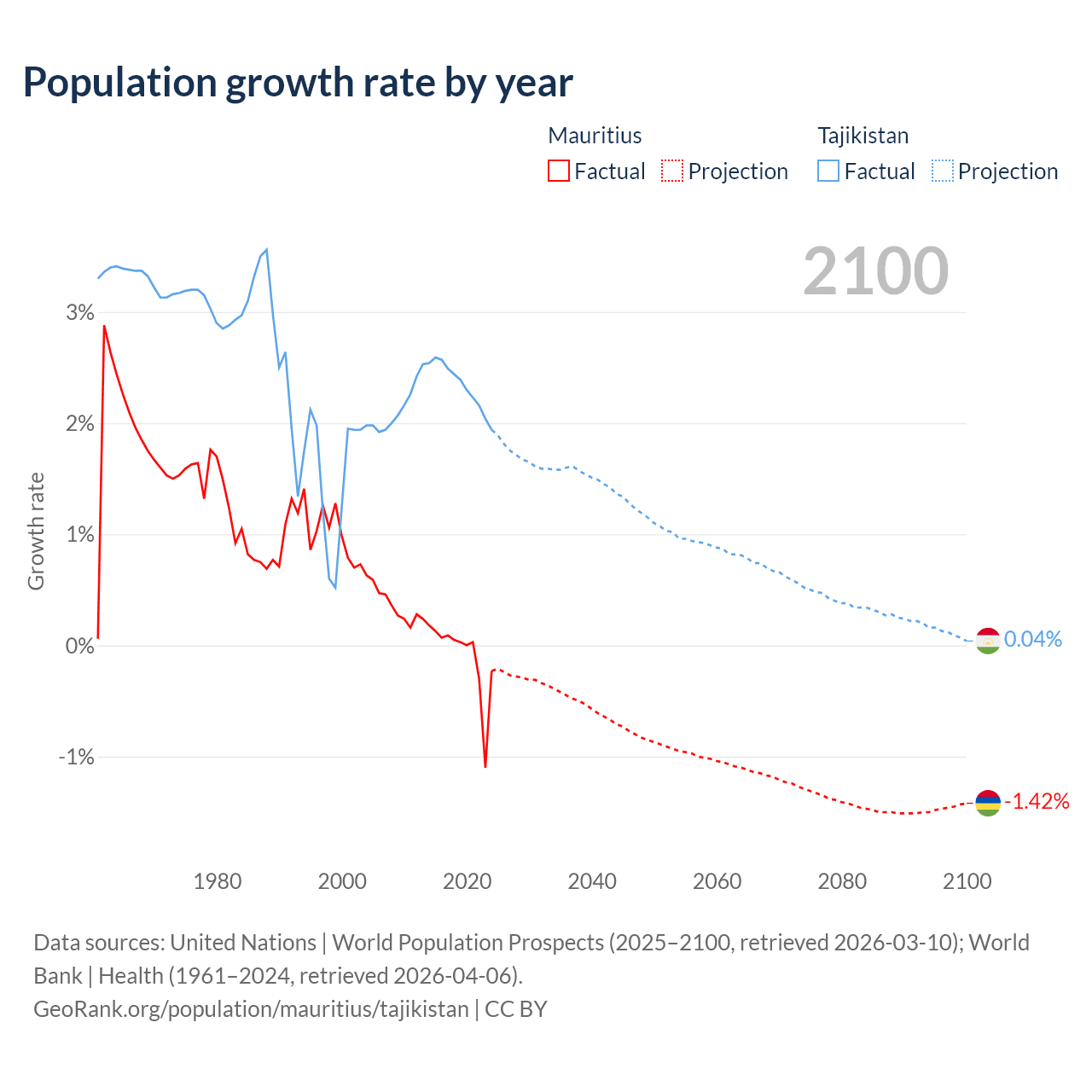 - For the last 10 years, Mauritius has had an average growth rate of -0.09% per year vs +2.33% in Tajikistan.