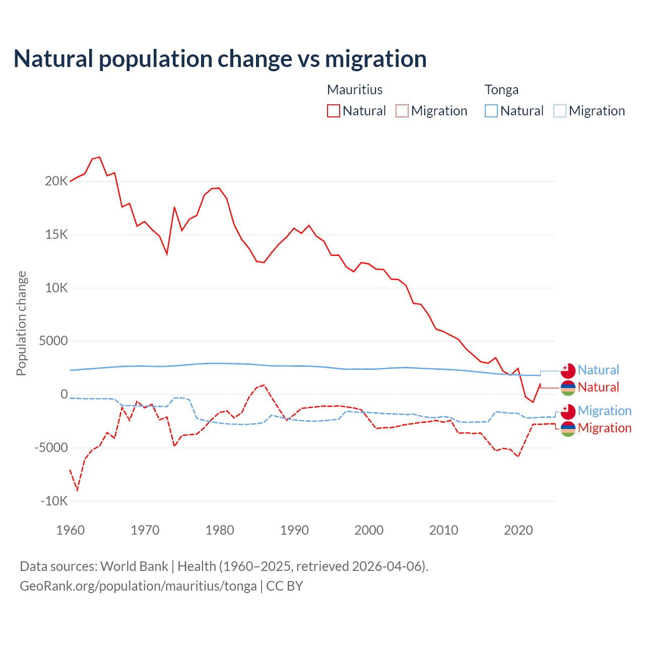 Over the last 10 years, 30.9% of the population change in Mauritius is from natural causes (a gain of 19,327 people) and 69.1% is from migration (a loss of 43,294 people). In Tonga 46.9% is from natural causes (a gain of 18,919 people) and 53.1% is from migration (a loss of 21,384 people).