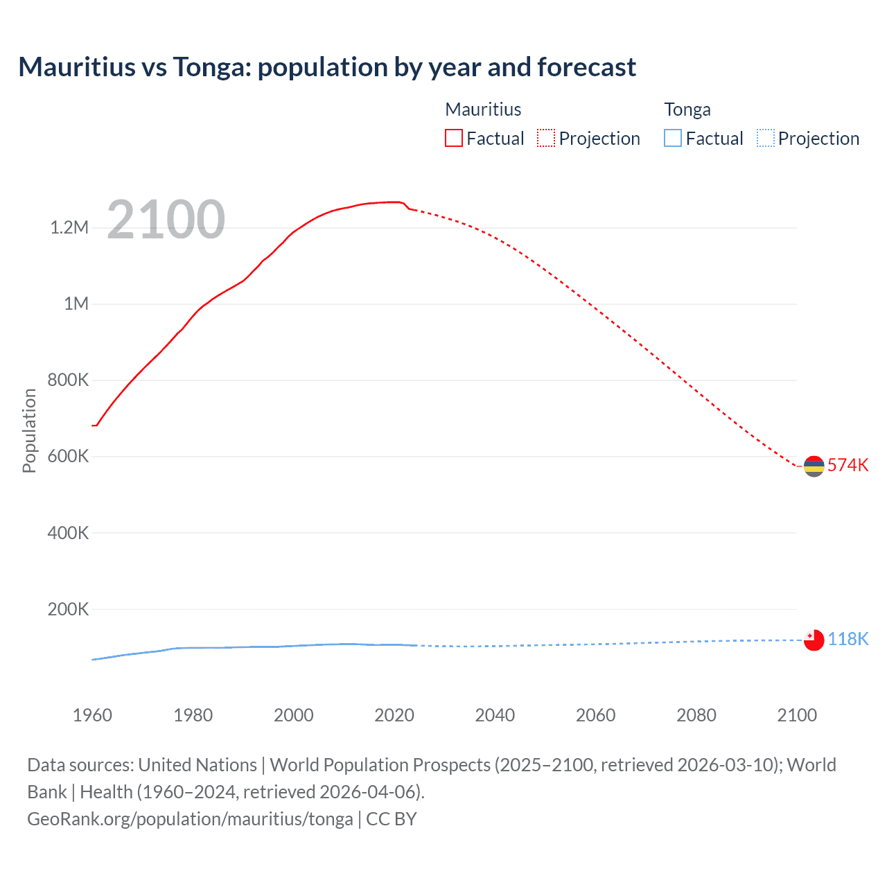 - Since 2006, the population of Mauritius has increased from 1.23M people to 1.24M (0.5% growth), while Tonga has declined from 106K to 103K (2.77% decline).