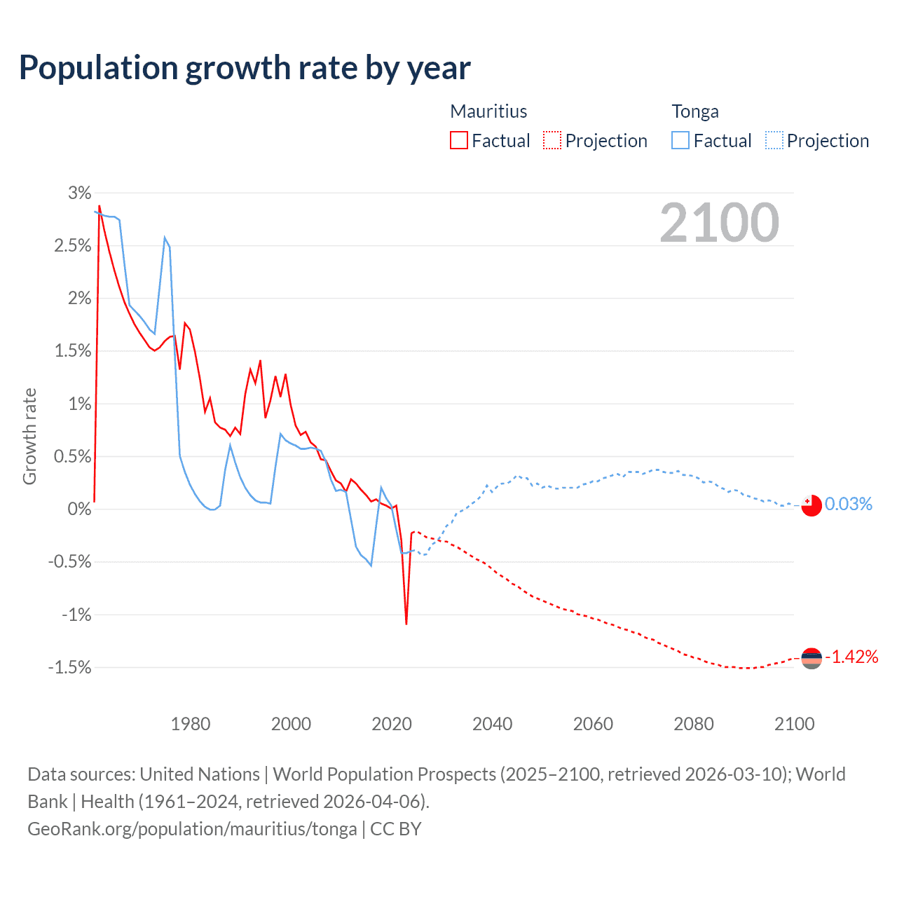- For the last 10 years, Mauritius has had an average growth rate of -0.09% per year vs -0.25% in Tonga.