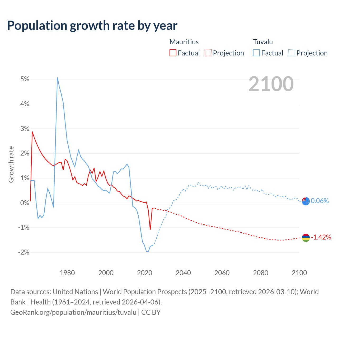- For the last 10 years, Mauritius has had an average growth rate of -0.09% per year vs -1.19% in Tuvalu.