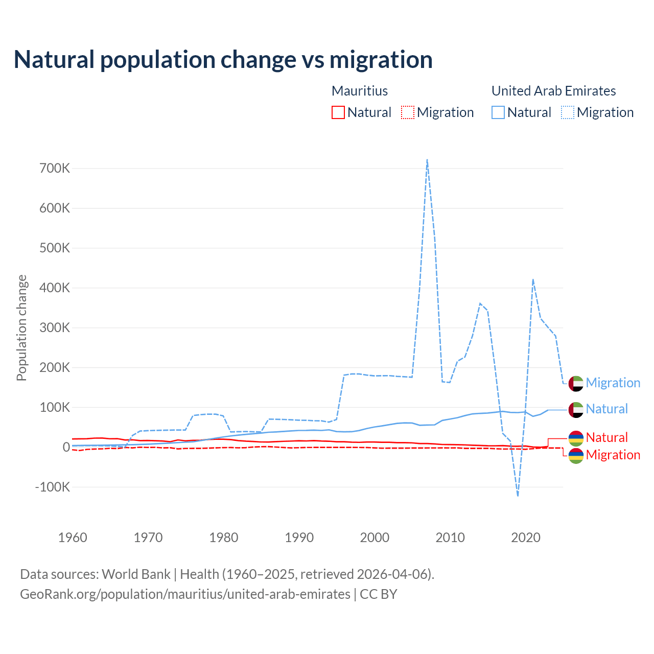 Over the last 10 years, 30.9% of the population change in Mauritius is from natural causes (a gain of 19,327 people) and 69.1% is from migration (a loss of 43,294 people). In the United Arab Emirates 30.5% is from natural causes (a gain of 857,996 people) and 69.5% is from migration (a gain of 1,958,520 people).