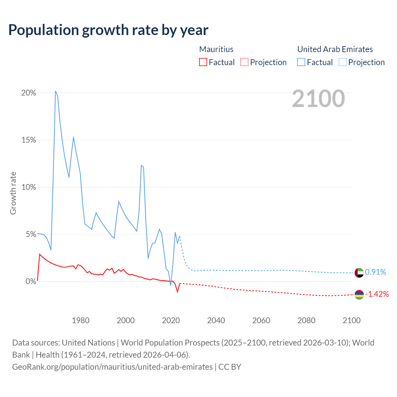 - For the last 10 years, Mauritius has had an average growth rate of -0.09% per year vs +3.31% in the United Arab Emirates.