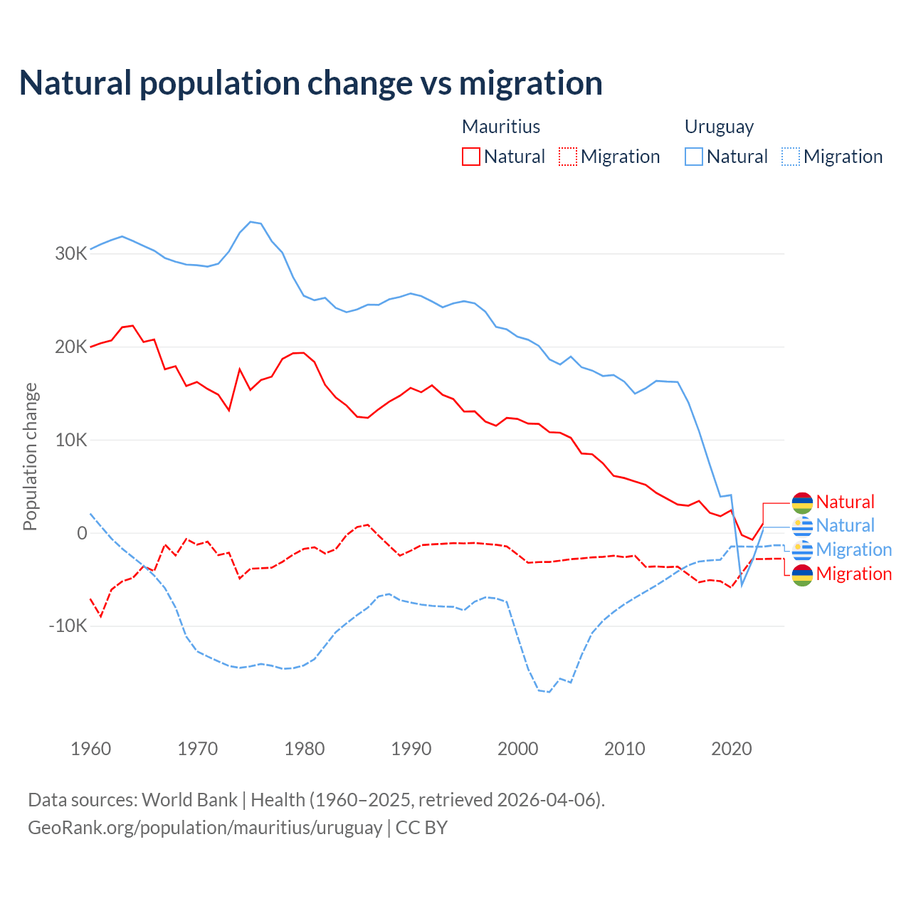 Over the last 10 years, 30.9% of the population change in Mauritius is from natural causes (a gain of 19,327 people) and 69.1% is from migration (a loss of 43,294 people). In Uruguay 70% is from natural causes (a gain of 64,303 people) and 30% is from migration (a loss of 27,501 people).