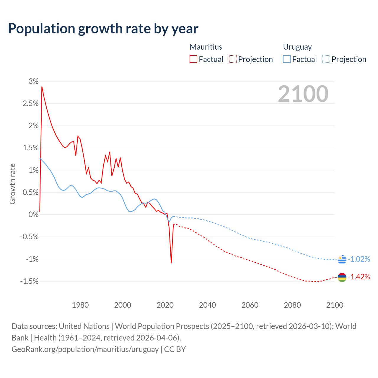 - For the last 10 years, Mauritius has had an average growth rate of -0.09% per year vs +0.11% in Uruguay.