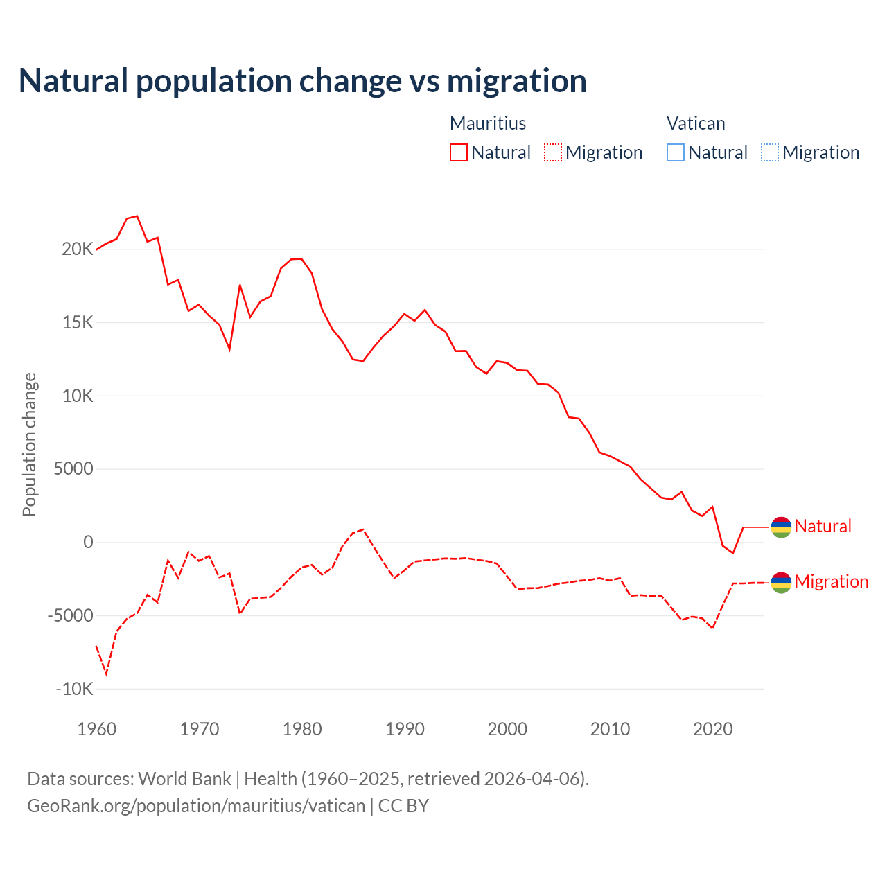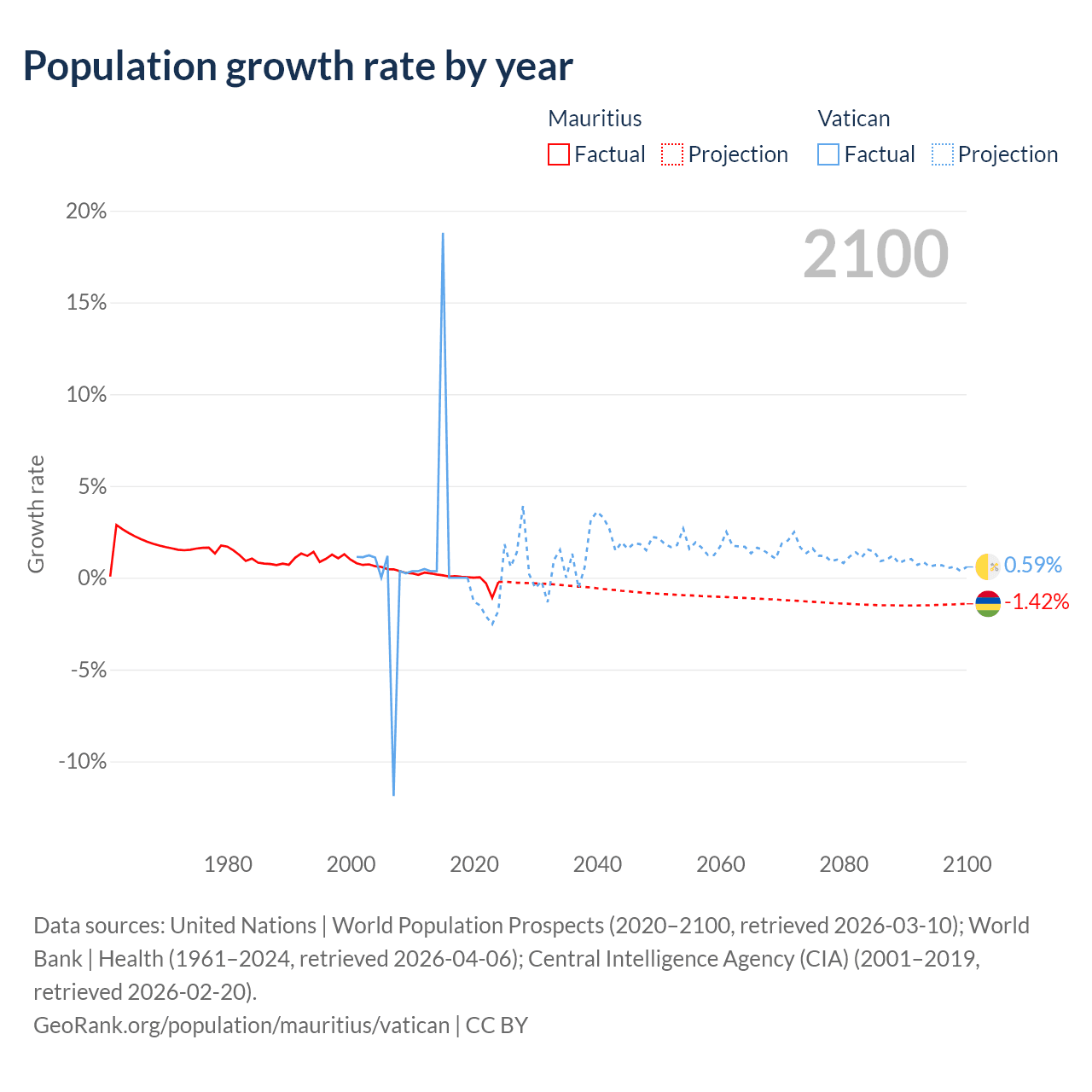 - For the last 10 years, Mauritius has had an average growth rate of -0.09% per year vs +1.9% in the Vatican.