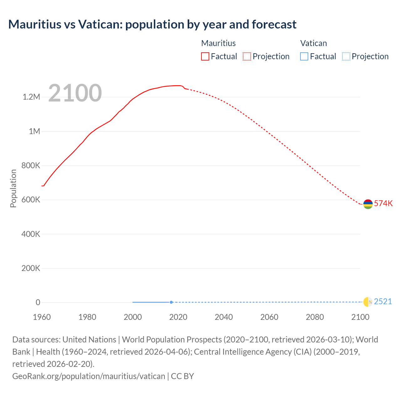Mauritius vs Vatican: population by year and forecast