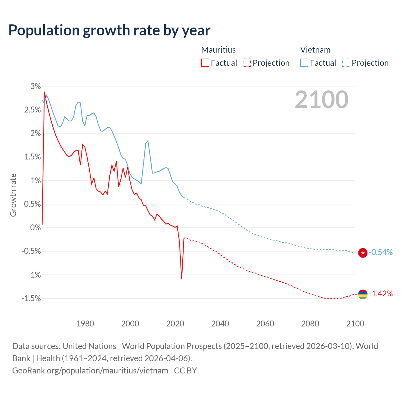 Data sources: World Bank | Health (1960–2024, retrieved 2026-04-06); United Nations | World Population Prospects (1960–2026, retrieved 2026-03-10); U.S. Census Bureau (1960–2025, retrieved 2026-02-08); Central Intelligence Agency (CIA) (2000–2019, retrieved 2026-02-20).