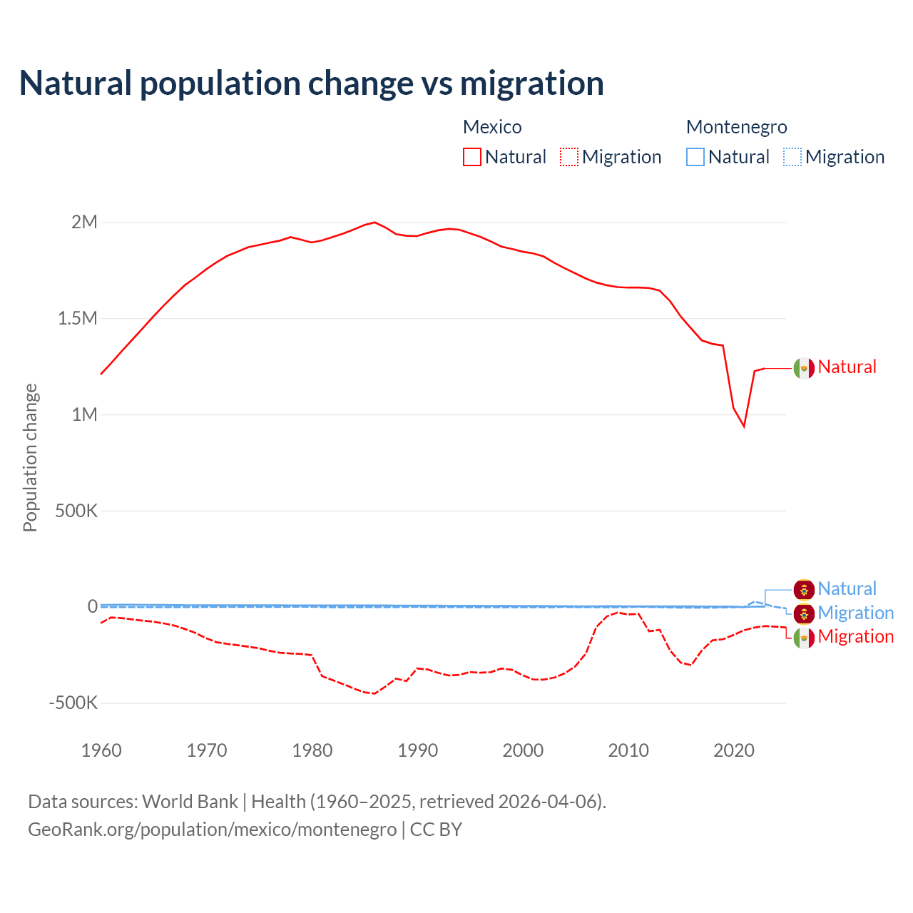 Over the last 10 years, 87.5% of the population change in Mexico is from natural causes (a gain of 13,080,136 people) and 12.5% is from migration (a loss of 1,876,544 people). In Montenegro 52.4% is from natural causes (a gain of 4,501 people) and 47.6% is from migration (a gain of 4,095 people).