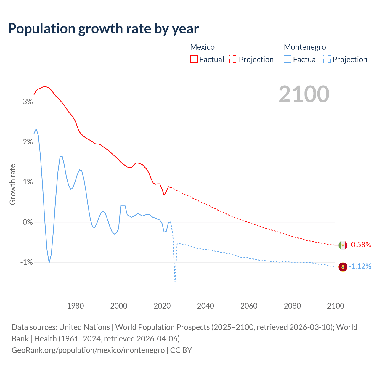 - For the last 10 years, Mexico has had an average growth rate of +0.92% per year vs +0.01% in Montenegro.