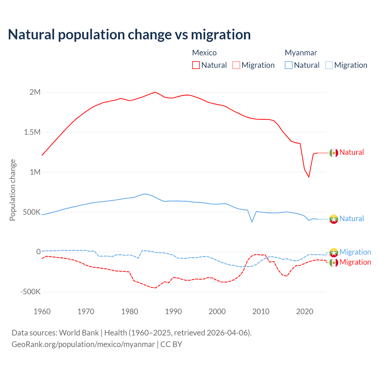 Over the last 10 years, 87.5% of the population change in Mexico is from natural causes (a gain of 13,080,136 people) and 12.5% is from migration (a loss of 1,876,544 people). In Myanmar 86% is from natural causes (a gain of 4,594,615 people) and 14% is from migration (a loss of 749,272 people).