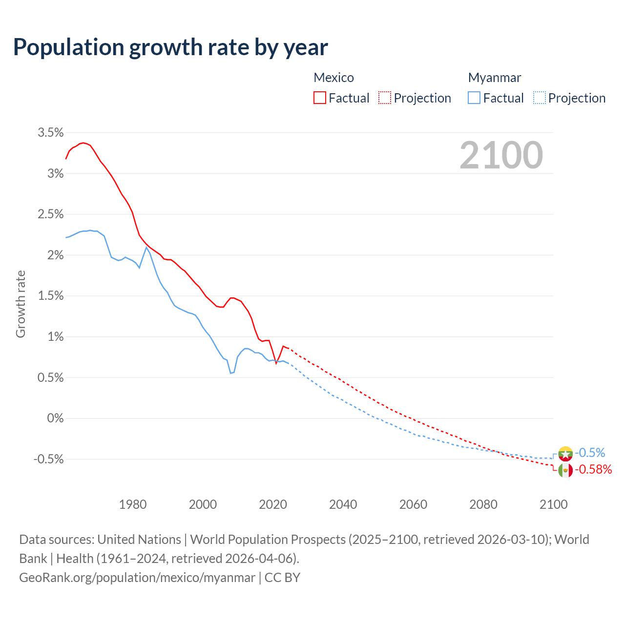- For the last 10 years, Mexico has had an average growth rate of +0.92% per year vs +0.74% in Myanmar.