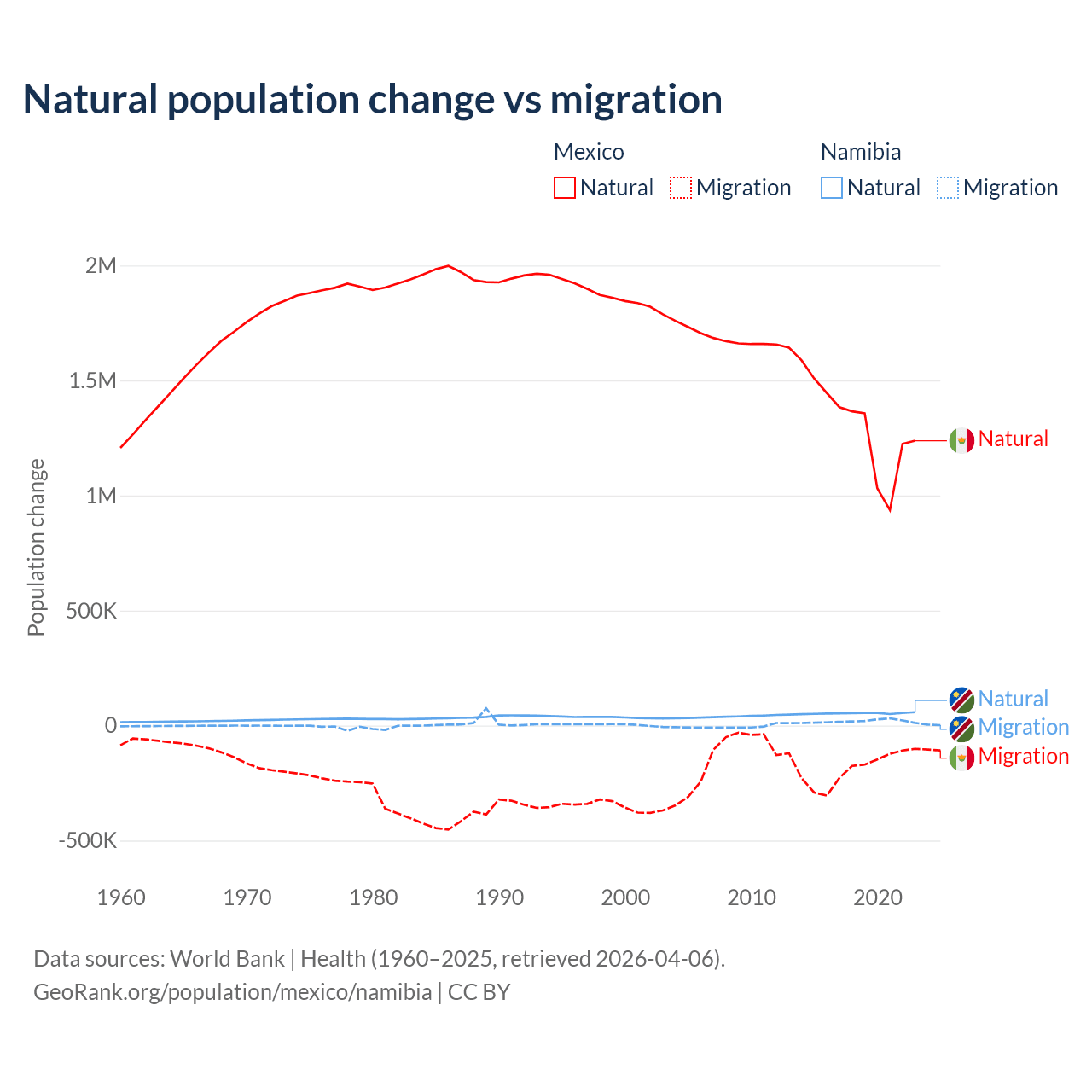 Over the last 10 years, 87.5% of the population change in Mexico is from natural causes (a gain of 13,080,136 people) and 12.5% is from migration (a loss of 1,876,544 people). In Namibia 74.3% is from natural causes (a gain of 532,532 people) and 25.7% is from migration (a gain of 183,837 people).