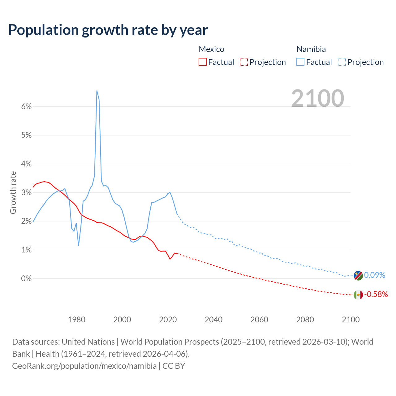 - For the last 10 years, Mexico has had an average growth rate of +0.92% per year vs +2.73% in Namibia.