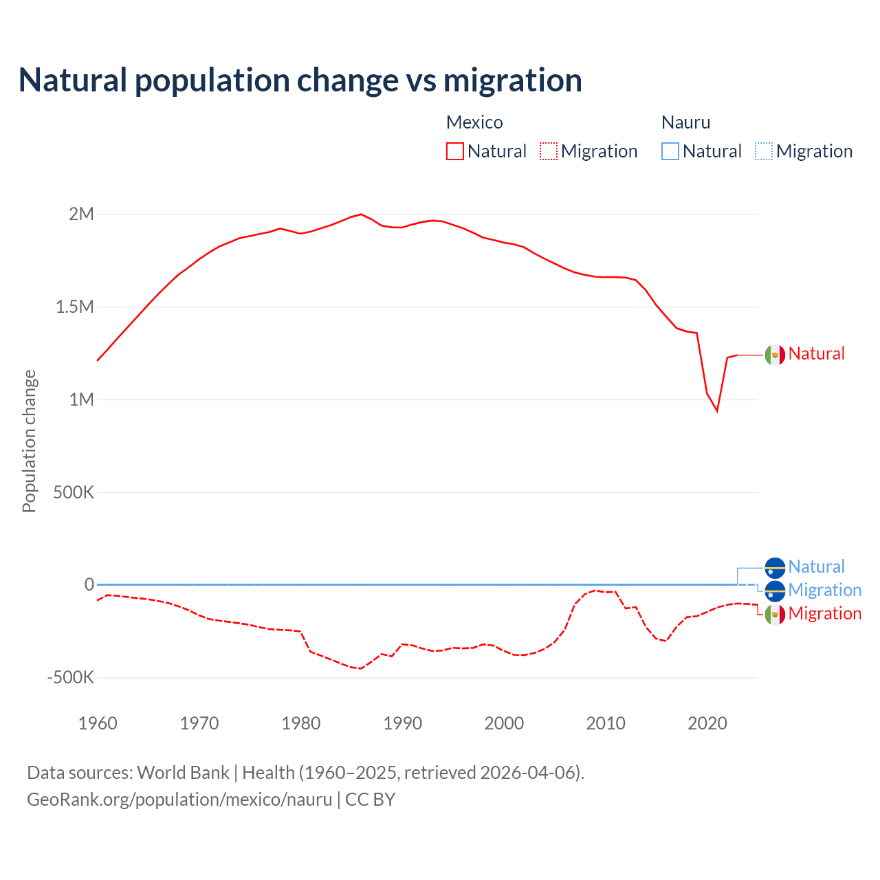 Over the last 10 years, 87.5% of the population change in Mexico is from natural causes (a gain of 13,080,136 people) and 12.5% is from migration (a loss of 1,876,544 people). In Nauru 66.2% is from natural causes (a gain of 2,590 people) and 33.8% is from migration (a loss of 1,320 people).