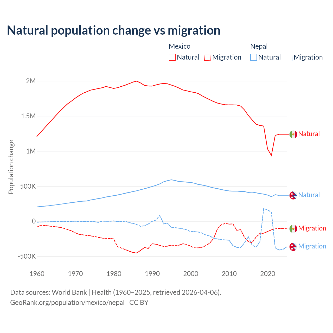 Over the last 10 years, 87.5% of the population change in Mexico is from natural causes (a gain of 13,080,136 people) and 12.5% is from migration (a loss of 1,876,544 people). In Nepal 67.9% is from natural causes (a gain of 3,909,749 people) and 32.1% is from migration (a loss of 1,851,664 people).