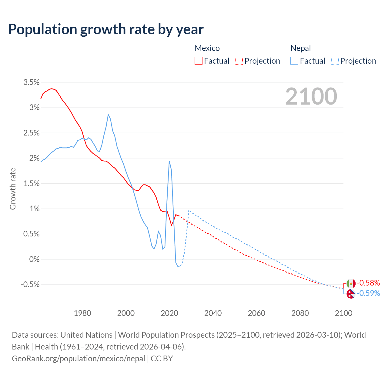 Data sources: World Bank | Health (1960–2024, retrieved 2026-04-06); United Nations | World Population Prospects (1960–2026, retrieved 2026-03-10); U.S. Census Bureau (1960–2025, retrieved 2026-02-08); Central Intelligence Agency (CIA) (2000–2019, retrieved 2026-02-20).