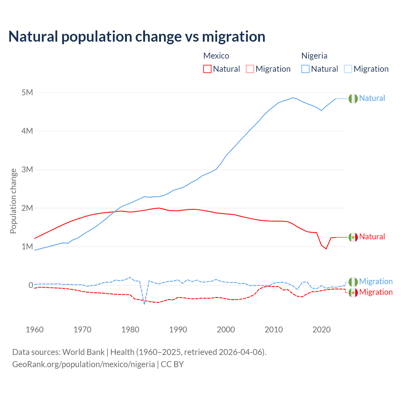 Over the last 10 years, 87.5% of the population change in Mexico is from natural causes (a gain of 13,080,136 people) and 12.5% is from migration (a loss of 1,876,544 people). In Nigeria 99.2% is from natural causes (a gain of 47,163,517 people) and 0.77% is from migration (a loss of 368,103 people).