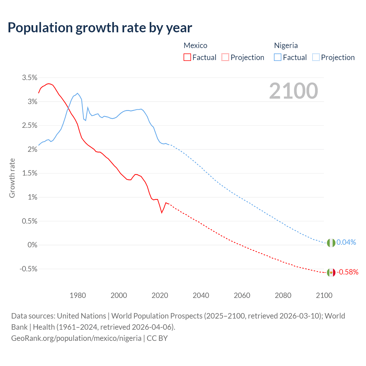 - For the last 10 years, Mexico has had an average growth rate of +0.92% per year vs +2.31% in Nigeria.