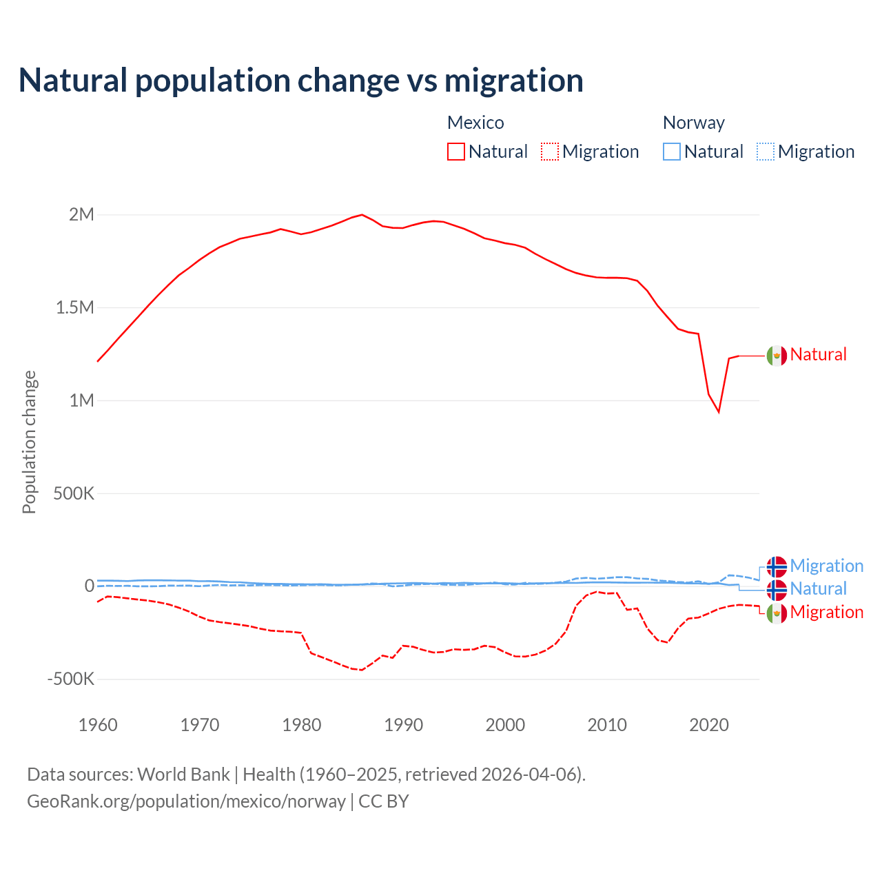 Over the last 10 years, 87.5% of the population change in Mexico is from natural causes (a gain of 13,080,136 people) and 12.5% is from migration (a loss of 1,876,544 people). In Norway 31.3% is from natural causes (a gain of 138,699 people) and 68.7% is from migration (a gain of 303,945 people).