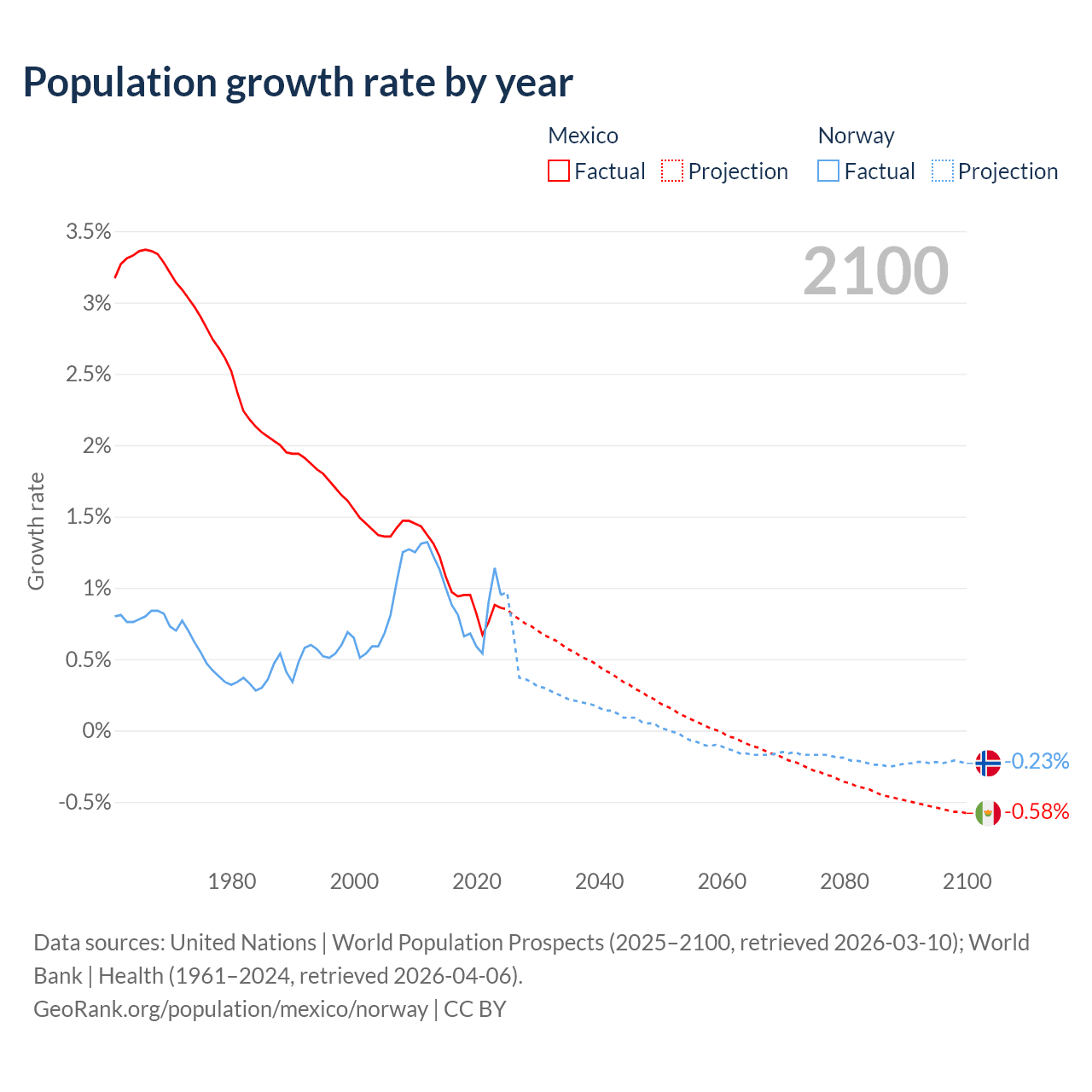 - For the last 10 years, Mexico has had an average growth rate of +0.92% per year vs +0.85% in Norway.