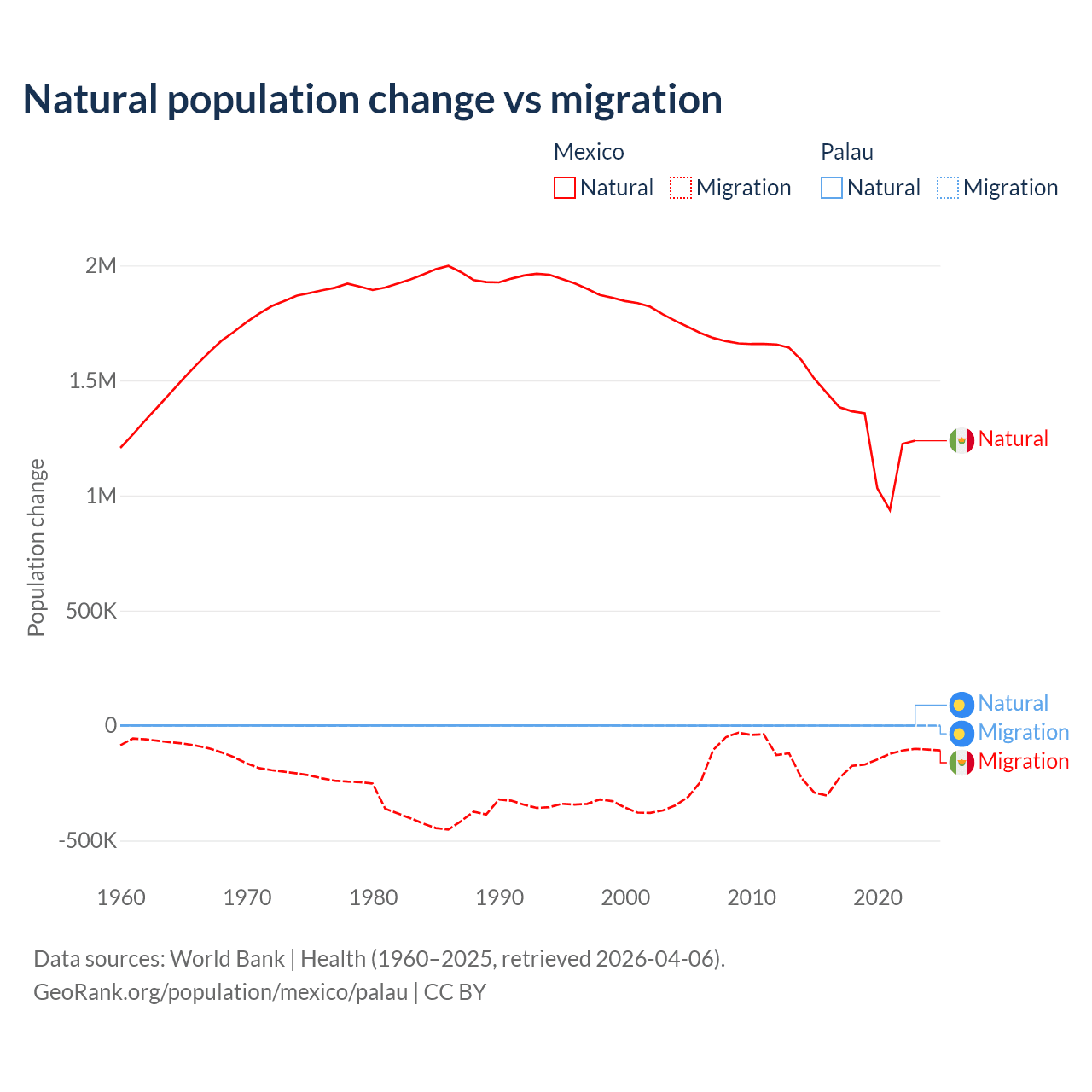 Over the last 10 years, 87.5% of the population change in Mexico is from natural causes (a gain of 13,080,136 people) and 12.5% is from migration (a loss of 1,876,544 people). In Palau 53.8% is from natural causes (a gain of 264 people) and 46.2% is from migration (a loss of 227 people).
