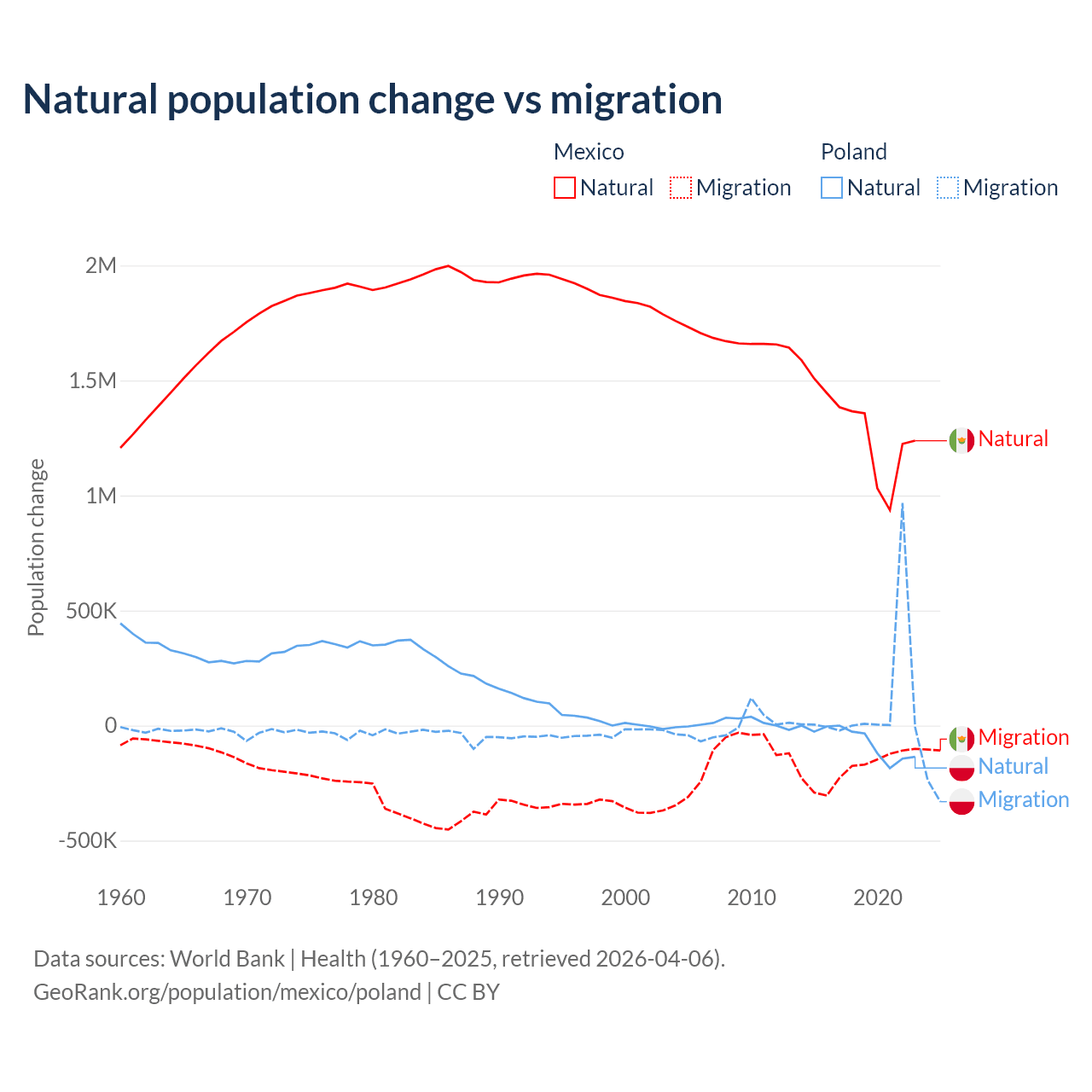Over the last 10 years, 87.5% of the population change in Mexico is from natural causes (a gain of 13,080,136 people) and 12.5% is from migration (a loss of 1,876,544 people). In Poland 41.4% is from natural causes (a loss of 675,443 people) and 58.6% is from migration (a gain of 955,766 people).