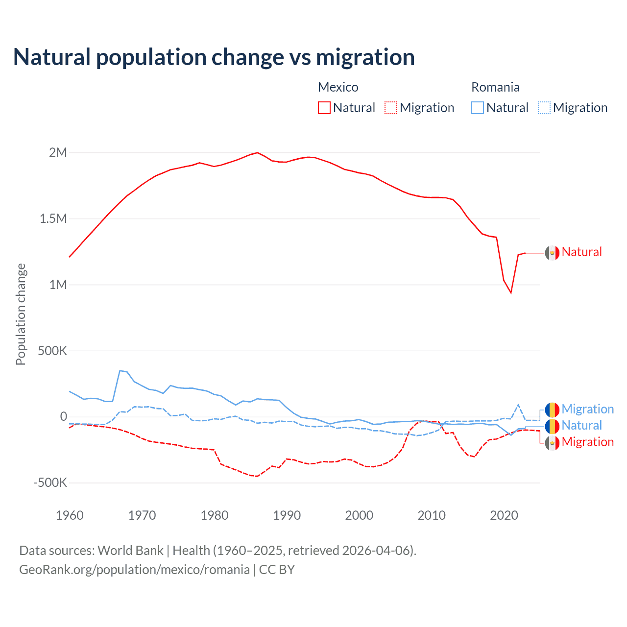Over the last 10 years, 87.5% of the population change in Mexico is from natural causes (a gain of 13,080,136 people) and 12.5% is from migration (a loss of 1,876,544 people). In Romania 82% is from natural causes (a loss of 766,295 people) and 18% is from migration (a loss of 167,917 people).