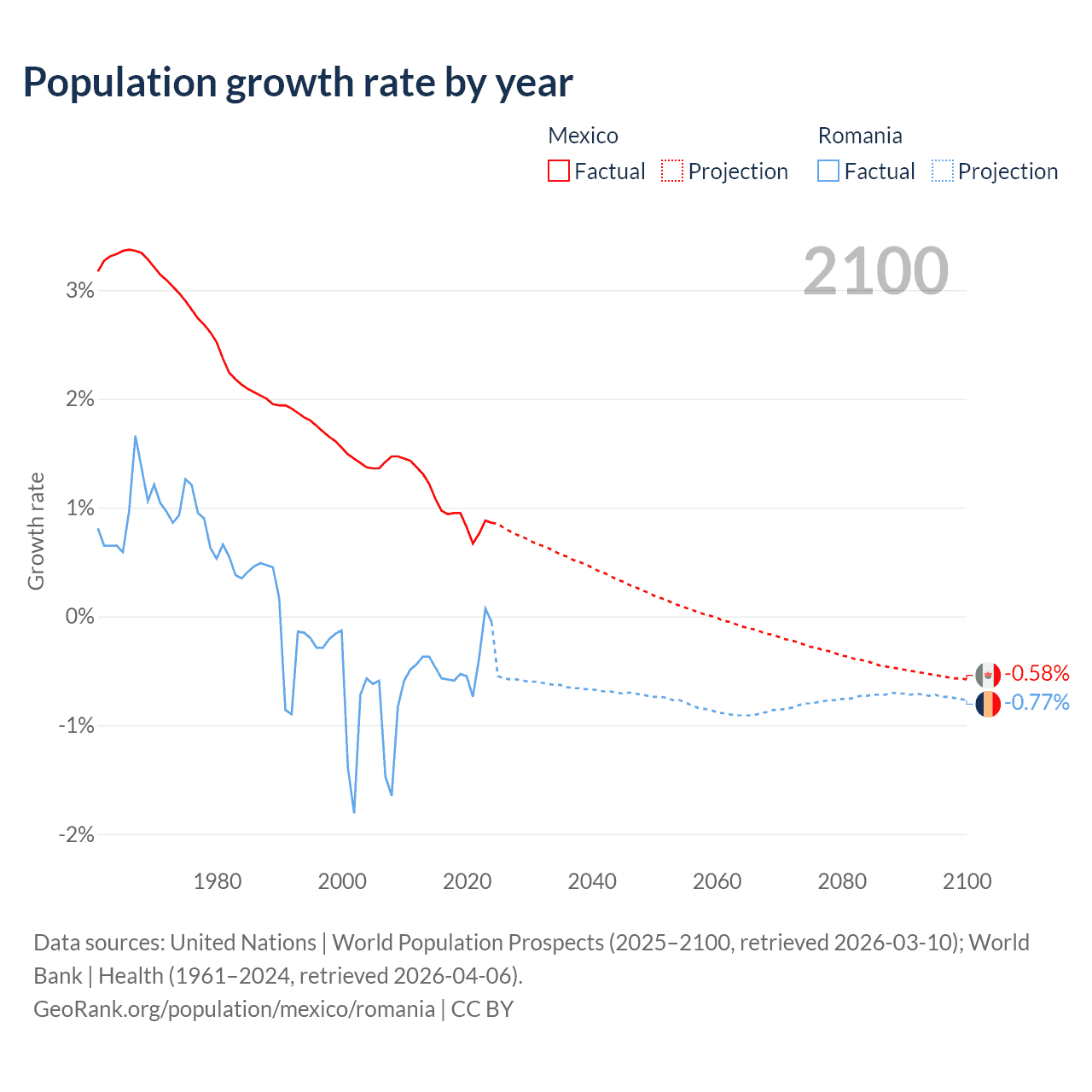 - For the last 10 years, Mexico has had an average growth rate of +0.92% per year vs -0.43% in Romania.