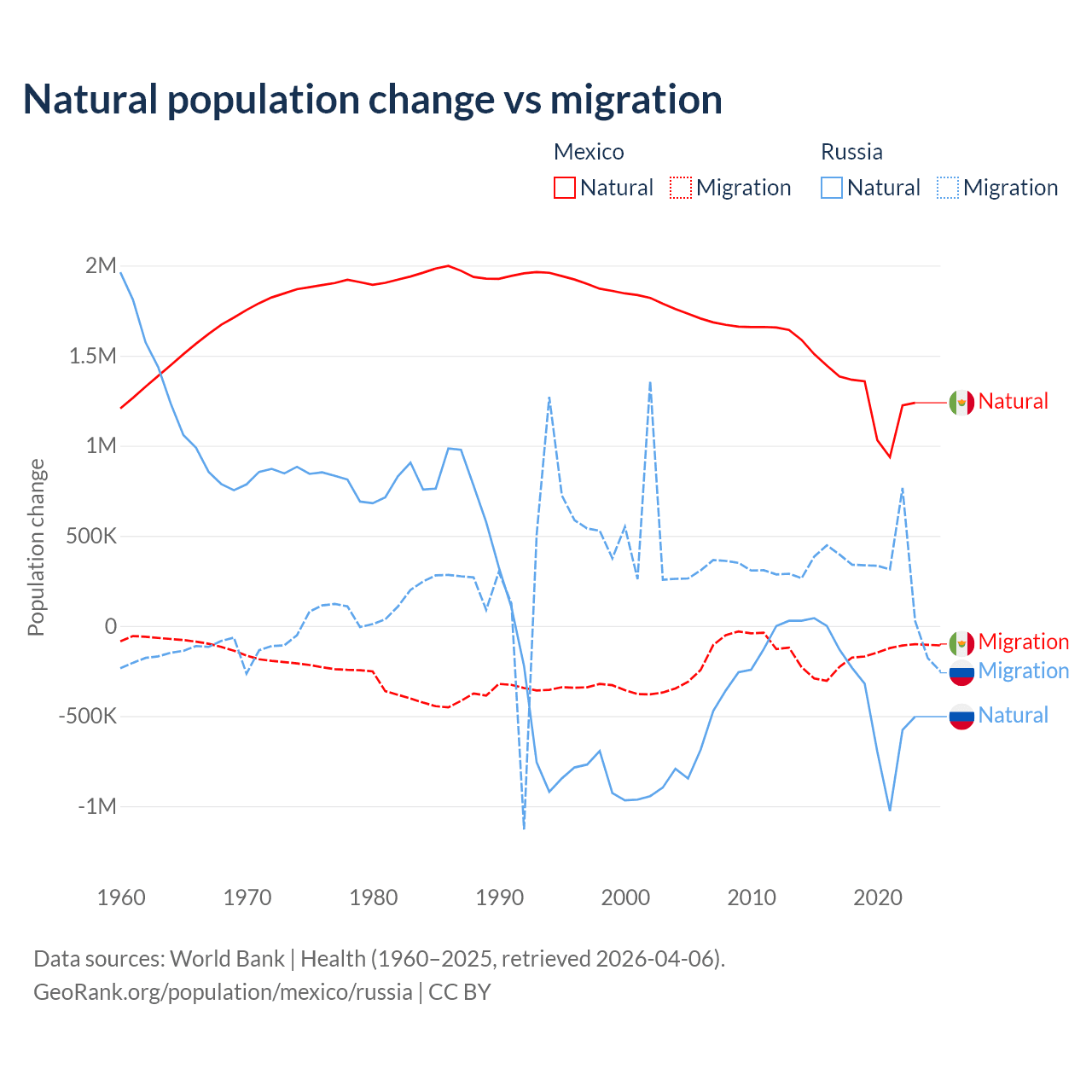 Over the last 10 years, 87.5% of the population change in Mexico is from natural causes (a gain of 13,080,136 people) and 12.5% is from migration (a loss of 1,876,544 people). In Russia 48.6% is from natural causes (a loss of 3,416,377 people) and 51.4% is from migration (a gain of 3,611,826 people).