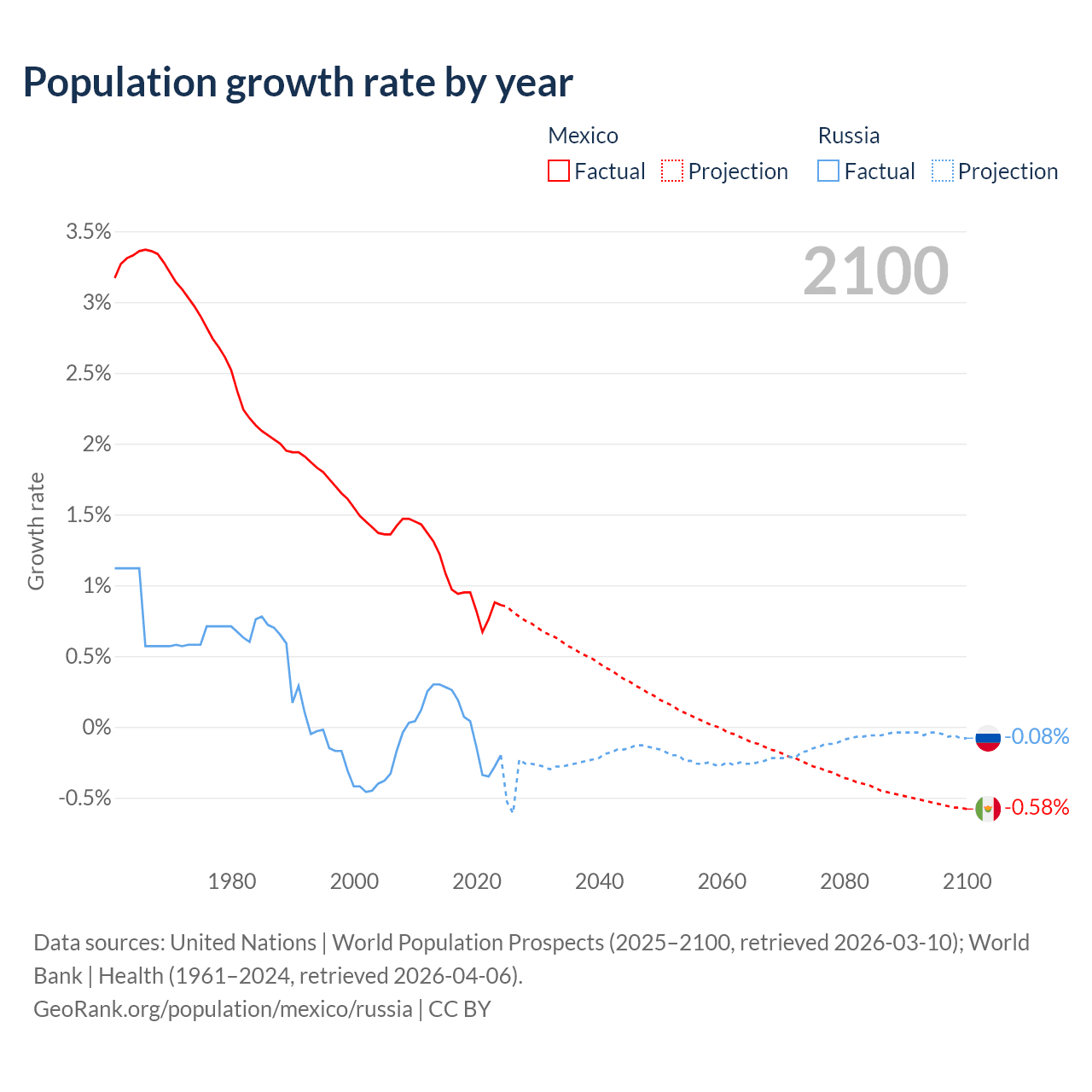 - For the last 10 years, Mexico has had an average growth rate of +0.92% per year vs -0.02% in Russia.