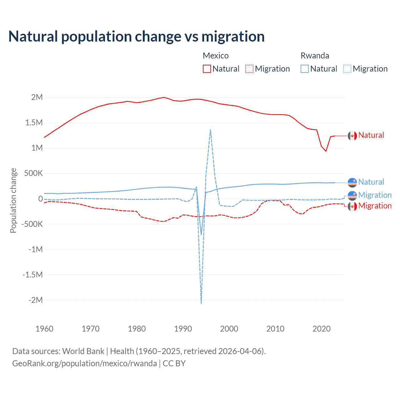 Over the last 10 years, 87.5% of the population change in Mexico is from natural causes (a gain of 13,080,136 people) and 12.5% is from migration (a loss of 1,876,544 people). In Rwanda 93.8% is from natural causes (a gain of 3,081,296 people) and 6.18% is from migration (a loss of 203,035 people).