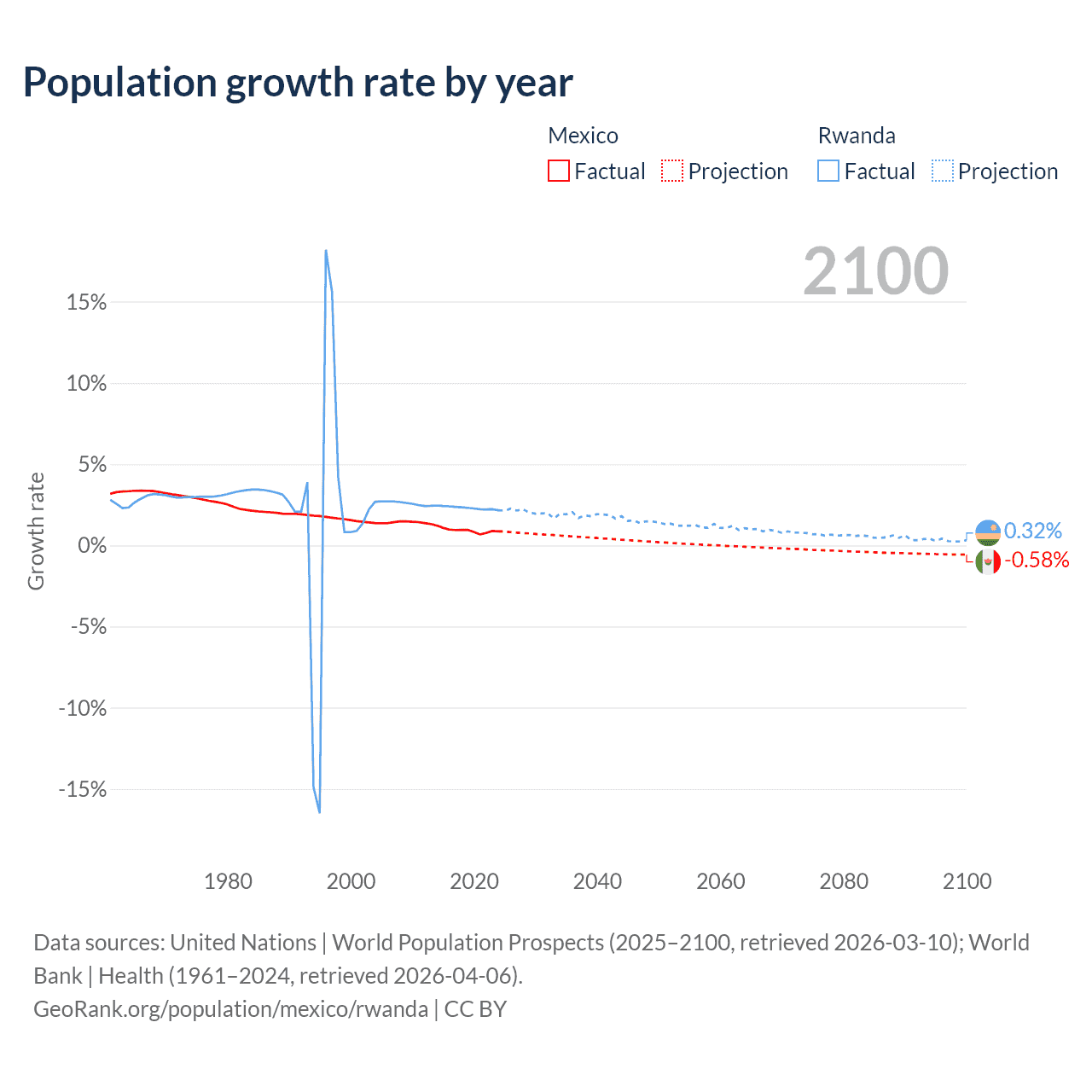 - For the last 10 years, Mexico has had an average growth rate of +0.92% per year vs +2.31% in Rwanda.