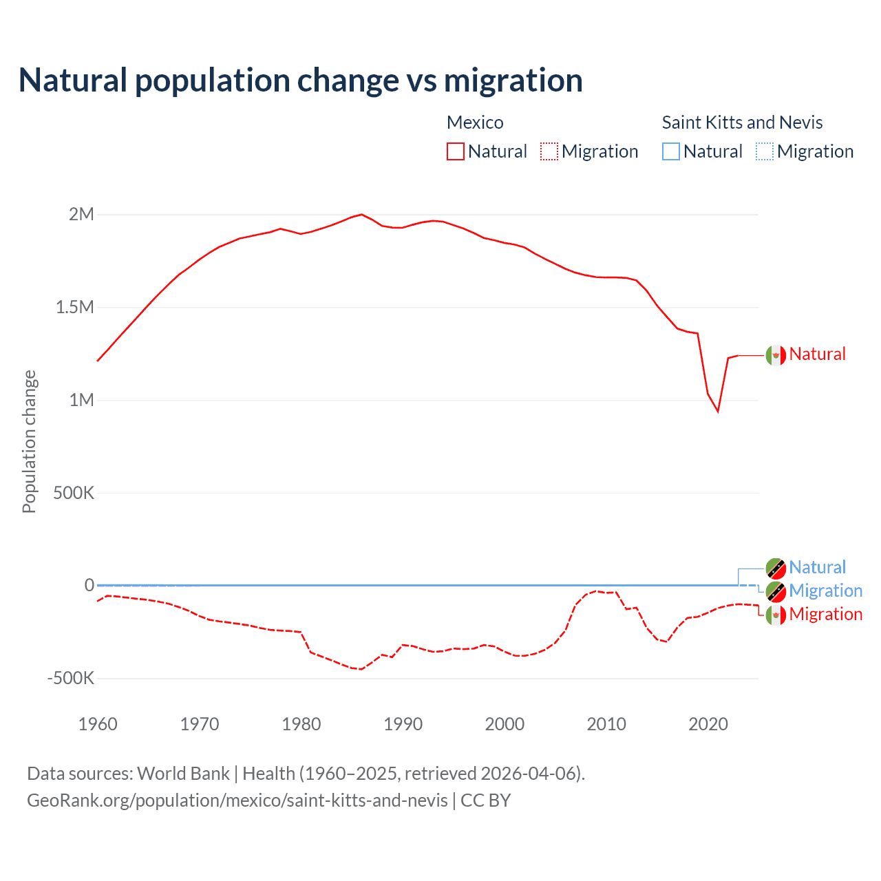 Over the last 10 years, 87.5% of the population change in Mexico is from natural causes (a gain of 13,080,136 people) and 12.5% is from migration (a loss of 1,876,544 people). In Saint Kitts and Nevis 44.9% is from natural causes (a gain of 1,225 people) and 55.1% is from migration (a loss of 1,506 people).