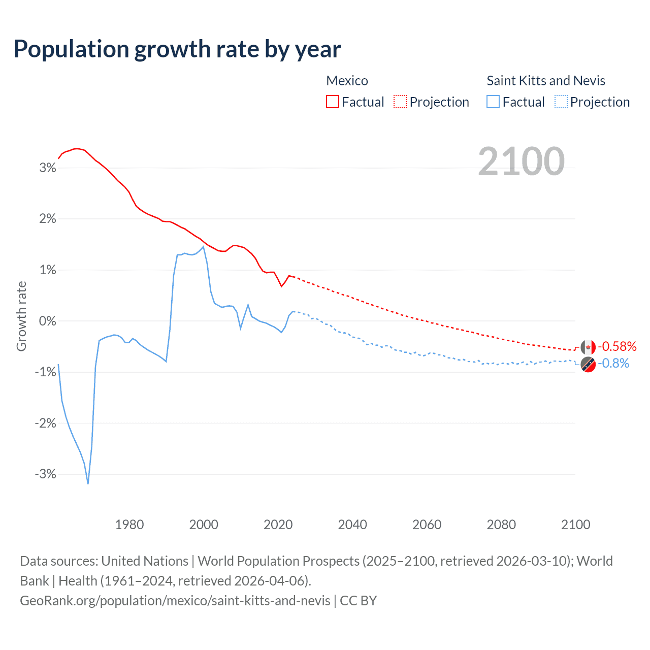- For the last 10 years, Mexico has had an average growth rate of +0.92% per year vs -0.04% in Saint Kitts and Nevis.