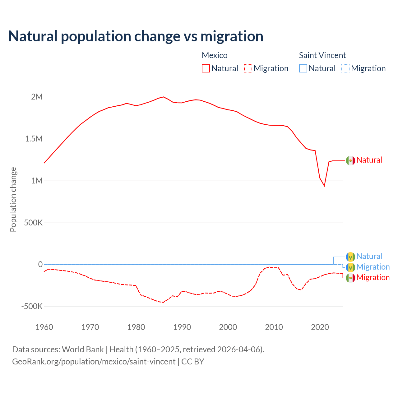 Over the last 10 years, 87.5% of the population change in Mexico is from natural causes (a gain of 13,080,136 people) and 12.5% is from migration (a loss of 1,876,544 people). In Saint Vincent 21.2% is from natural causes (a gain of 2,525 people) and 78.8% is from migration (a loss of 9,393 people).